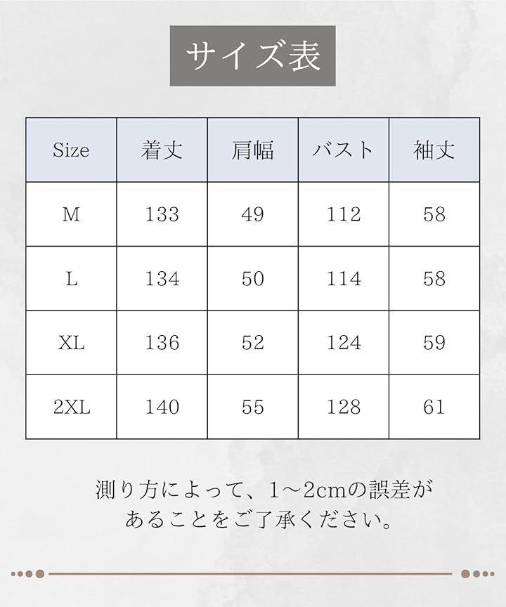 《M》着丈133,肩幅49,バスト112,袖丈58 《L》着丈134,肩幅50,バスト114,袖丈58 《XL》着丈136,肩幅52,バスト124,袖59 《2XL》着丈140,肩幅55,バスト128,袖丈61