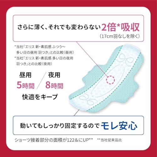 5時間べたつきにくい:経血をたっぷり吸収しても、5時間べたつきにくい※1。 たっぷり2倍※1吸収:スリムなのに超吸収ポリマーがぎっしり詰まっているので、普通のナプキンの2倍※1吸収。 わずか1.9mmの極薄シート:個包装もスリムで持ち運び時もコンパクト。 動いてもしっかり固定:ショーツ接着部分の面積※2UPで動いてもモレ安心。 足まわりの違和感低減:両サイドのフチ部分のなめらかさ4%UP※2。</br>※1 当社「エリス 新・素肌感 ふつう~多い日の昼用 羽つき」との比較</br>※7 当社従来品比 (#lf)(#lf)(#lf)商品購入前に、ストア紹介ページをご確認ください。
