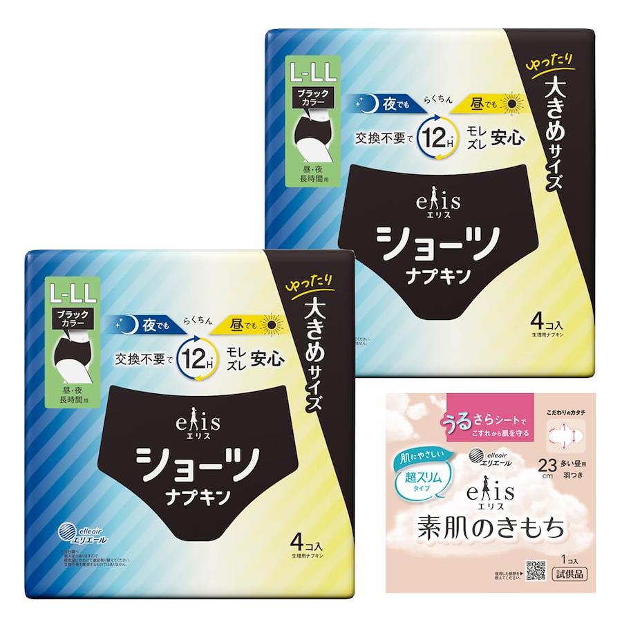 エリスブランドメッセージ: だれかではなく、あなたのそばに。 ひとの数だけ、くらしや価値観があるように。 生理に対する想いや悩みは、ひとりひとり違うから。 エリスは、ほかのだれかではない、あなたの気持ちを大切に。 あなたが望む生理の過ごし方を支えていきたい。 繊細な肌に直接ふれ、こころとからだに向き合うからこそ、 これまでのあたり前にしばられない発想で ひとりひとりと生理の関係を、もっとここちよく。 あなたがあなたらしくいられるように。 今日もエリスが、そばにいます。 多い日もモレ不安0へ。ズレに強いショーツ型で全方位がっちりホールド。 夜用ナプキン3枚分※の吸収力。量が多い日の経血もしっかり吸収。※当社「エリス新・素肌感 多い日の夜用羽つき」との比較 気にならない薄型吸収体。薄型だからゴワゴワせずに動きも快適。 交換不要で12時間※モレ・ズレ安心。夜でも昼でもらくちん。※当社調べ。個人差がありますので経血量に合わせて適宜取り替えてください。交換不要を推奨するものではありません。 スタイリッシュなブラックカラー。履くときも捨てる時も気にならない。