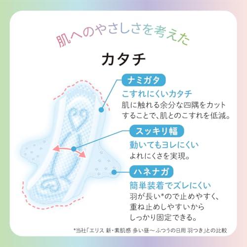 エリスブランドメッセージ: だれかではなく、あなたのそばに。 ひとの数だけ、くらしや価値観があるように。 生理に対する想いや悩みは、ひとりひとり違うから。 エリスは、ほかのだれかではない、あなたの気持ちを大切に。 あなたが望む生理の過ごし方を支えていきたい。 繊細な肌に直接ふれ、こころとからだに向き合うからこそ、 これまでのあたり前にしばられない発想で ひとりひとりと生理の関係を、もっとここちよく。 あなたがあなたらしくいられるように。 今日もエリスが、そばにいます。 ズレ・ヨレ違和感・肌のこすれ0へ。動きについてくるスライドフィット吸収体を搭載。 独自開発の中空構造ナプキン。ナプキン内部に空間層を持つから吸収体が自在にスライド。 吸収体が動きに合わせてフィット。肌とナプキンがこすれにくく、※2負担を軽減。※2肌への摩擦によるせん断応力を約20%低減。(当社従来品比) 【ハネナガ】簡単装着でズレにくい:羽が長い※1ので止めやすく、重ね止めしやすいからしっかり固定できる。※1当社「エリス新・素肌感多い昼~ふつうの日用羽つき」との比較 【ナミガタ】肌に触れる余分な四隅をカットすることで、肌とのこすれを低減。 (#lf)(#lf)(#lf)商品購入前に、ストア紹介ページをご確認ください。