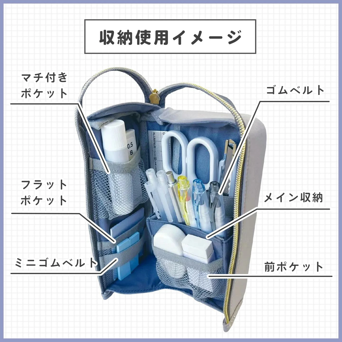 【エルガバ スタンド】L字にガバッと開いて立てて使えるスタンド型ペンケース『エルガバ スタンド』。多彩な収納機能で物の定位置がぴったり決まり、使いたいものがすぐに見つかって取り出しやすい!ハンドル付きで持ち運んだりフックにかけたりしやすいのも嬉しいポイントです。文具入れとしてはもちろん、コスメやDIYキット、ガジェットの収納にも◎年齢性別問わず使いやすいシンプルなデザインです。