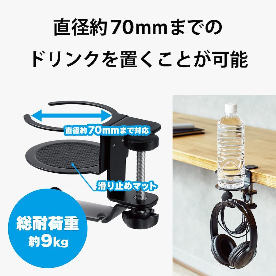 ■ヘッドホンとドリンクをまとめて収納できる、ドリンクホルダー付きのヘッドホンスタンドです。 ■ヘッドホンのハンガー部は360度回転可能でデスク下に収納できるので、使用したいときだけデスク下からヘッドホンを取り出すことができます。 ■クランプ式で、デスク下にしっかり取り付けられます。 ■天板厚み約50mmまでのデスクに対応します。 ■直径約70mmまでのドリンクを置くことができます。 ■ハンガー部にはプラグやコードを引っ掛けることができるフックが付いています。