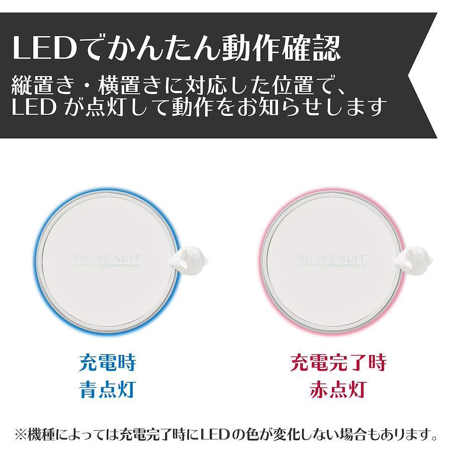 ■ LED発光色:通電:赤3秒点灯/待機:消灯/充電中:青点灯/充電完了:赤点灯/エラー時:赤青点滅※底面ボタンの操作によってON/OFF切替が可能※機種によっては充電完了時にLEDの色が変化しない場合があります。