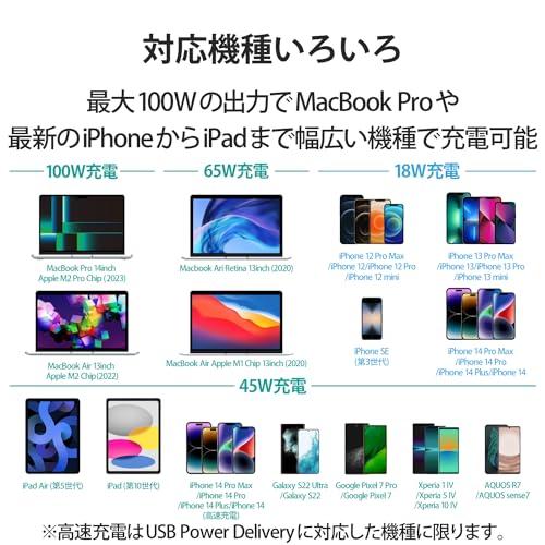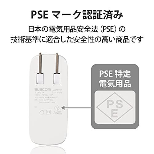 【 説明 】■USB Power Deliveryに対応したUSB Type-C(TM)(USB-C(TM))ポートを搭載し、対応するノートパソコンやスマートフォン、タブレットなどを超高速充電ができるUSB AC充電器です。■従来のシリコン半導体と比べると発熱を抑える事が出来る材料「GaN(窒化ガリウム)」を採用することで、製品の小型化及び軽量化を実現しました。■USB Power Delivery (パワーデリバリー)とは、アダプターと接続機器間で情報をやり取りすることで、その機器間における適した電力を選択し、高速充電を実現するUSB規格です。100W(※)という高電力に対応するため、さまざまな機器での利用が広がっています。※本製品のUSB Power Delivery出力は100Wです。■小型・軽量なので外出や出張などの際の持ち運びに便利です。■USB Type-C(TM)(USB-C(TM))ポートは端末に応じて出力が5V/3A、9V/3A、15V/3A、20V/5Aと可変し、iPhoneなどのスマートフォンから、NINTENDO SWITCH(TM)などのゲーム機、対応のノートパソコンまで幅広く高速充電できます。※NINTENDO SWITCH(TM)はドックでの充電はできません。■USB協会指定の試験に合格した信頼性の高いUSB Type-C(TM)(USB-C(TM))ポートを搭載していますので・心配なく使用いただけます。■コンセントプラグには本体に収納できる90度スイングプラグ機構を採用しています。■耐トラッキング性の要求事項(PSE:電気用品法)を満たしたコンセントプラグを採用しています。■※本製品にケーブルは同梱しておりません。別途MFi認証品のUSB Type-C(TM)(USB-C(TM)) to LightningケーブルやエレコムのUSB規格認証USB Type-C(TM)(USB-C(TM)) to USB Type-C(TM)(USB-C(TM))ケーブル等をご用意ください。※本製品はUSB Type-C(TM)(USB-C(TM)) - MagSafe 3ケーブルを利用した充電には対応しておりません。MagSafe 3ケーブルを利用の際は純正の充電器をご使用ください。※ノートパソコンなどの充電を行う際は20V・5A出力に対応したUSB Type-C(TM)(USB-C(TM)) to USB Type-C(TM)(USB-C(TM))ケーブルをご使用ください。■※端末本体や充電器が濡れた状態で充電すると、異常な発熱・焼損の原因となり大変危険ですのでおやめください。■※USB Type-C and USB-C are trademarks of USB Implementers Forum■自社環境認定基準を1つ以上満たし、『THINK ECOLOGY』マークを表示した製品です。■廃棄物削減に取り組み、製品に同梱する取扱説明書等をペーパーレス化した製品です。■環境保全に取り組み、製品の包装容器におけるプラスチック重量を、社内基準製品より20%以上削減した製品です。