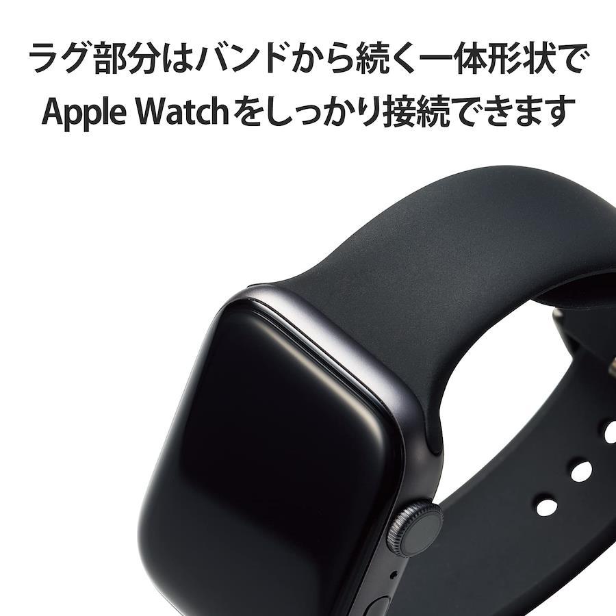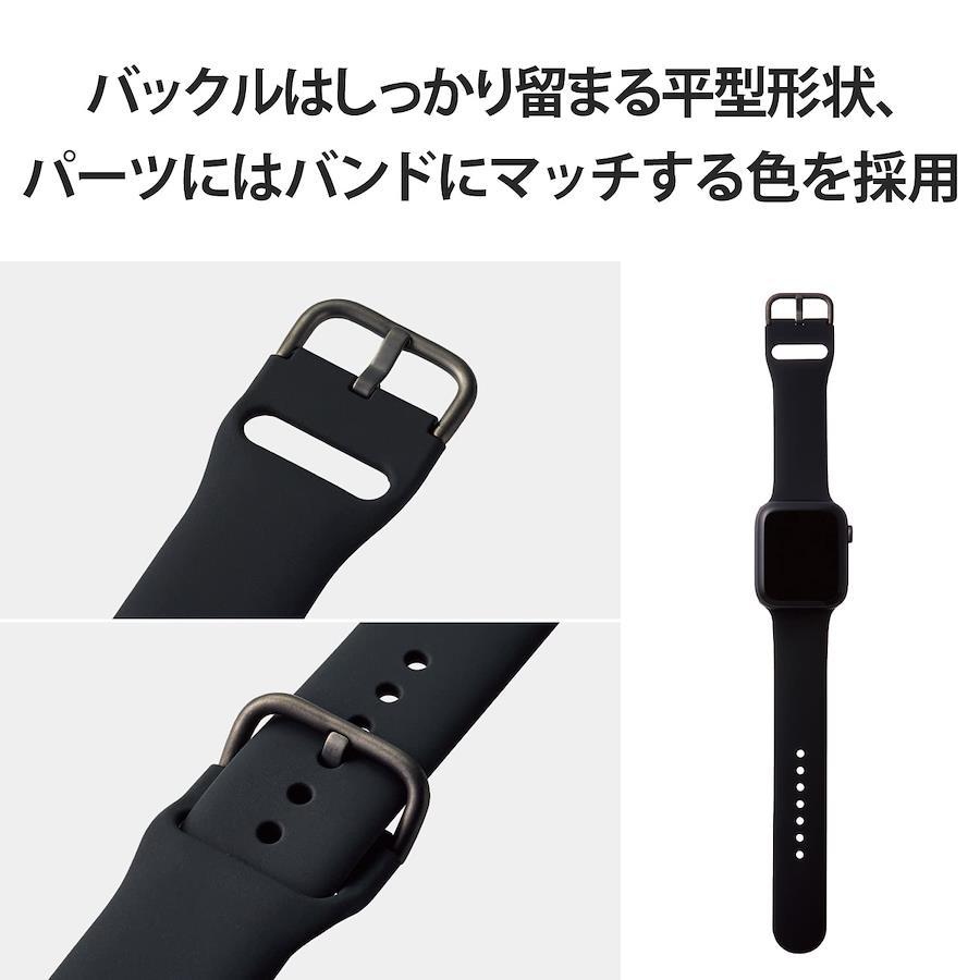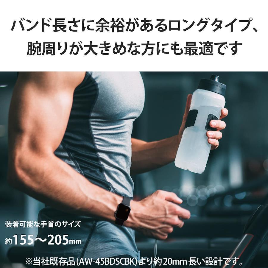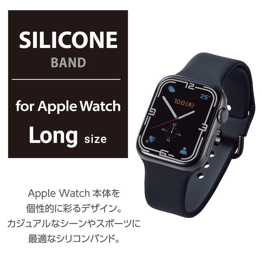 【 説明 】■ 汗や水に強く装着感の良いシリコン素材を採用した、Apple Watch用シリコンバンドです。■ 当社既存品(AW-45BDSCBK)より約20mm長く、腕周りの太い人でも装着できるサイズです。■ バックル側のベルトループに剣先側を通すことで、剣先がバンドと腕の間に収まり、すっきりと装着できます。■ ラグ部分はバンドから続く一体形状で成形されており、Apple Watchとバンドをしっかり接続します。■ バックルの突棒はしっかり留まるように平型形状にデザインしています。■ バンドをApple Watchに装着したままで液晶画面の確認、本体の操作、各種ボタン操作、純正の磁気充電ケーブルへの設置が可能です。