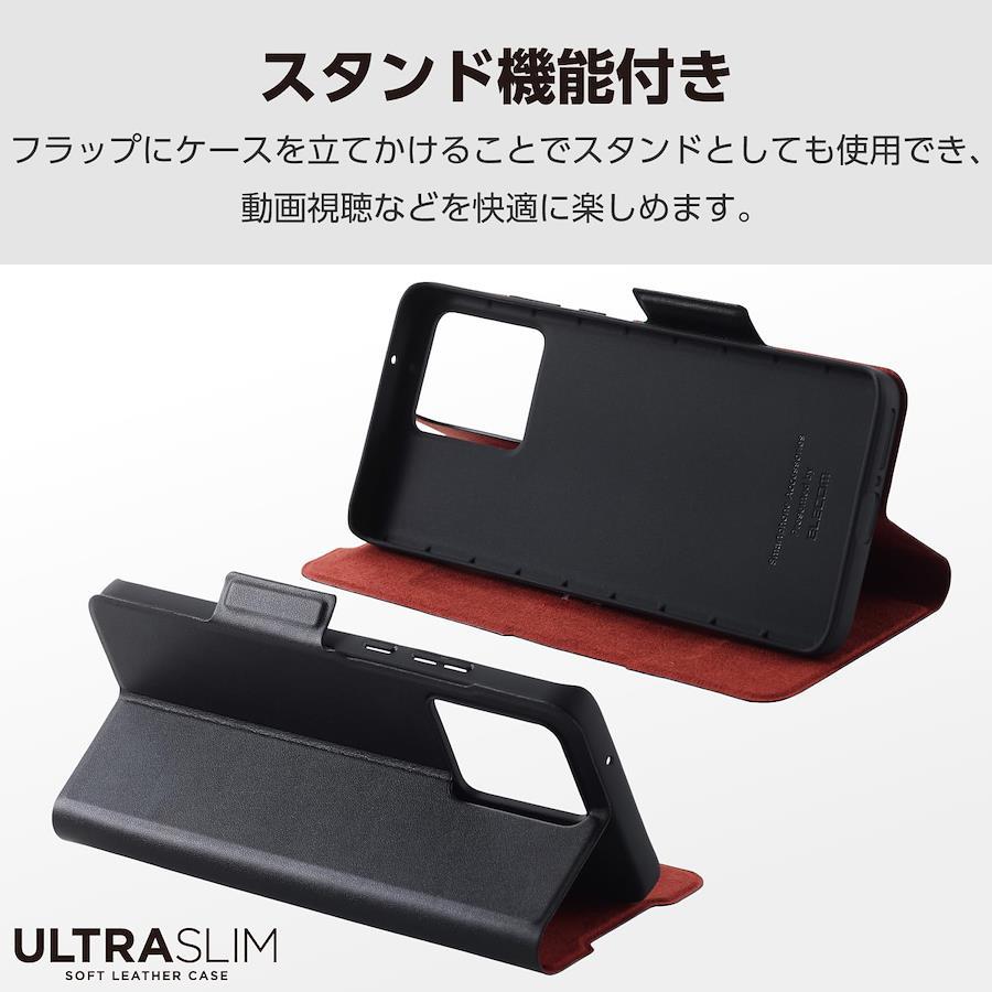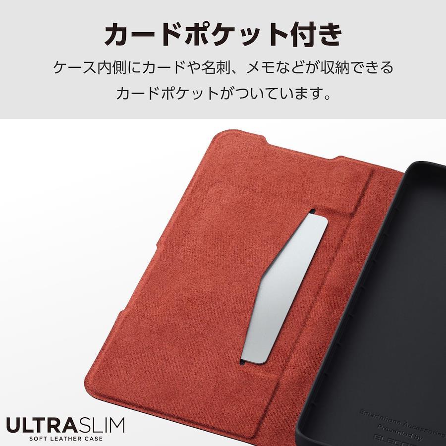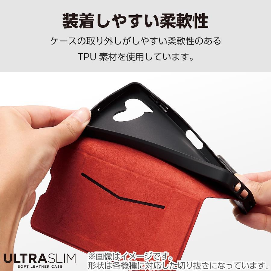【説明】■端末の薄さや軽さを損ねない、薄型・超軽量なウルトラスリムタイプのソフトレザーケース(手帳型)です。■端末装着部分に衝撃を吸収するTPU(熱可塑性ポリウレタン)素材を使用し、端末を衝撃から守ります。■落下時に最も大きな衝撃が予想される四つ角にエアークッションを設置し、効率的に衝撃を吸収します。■不使用時に画面部分をカバーする、横開きタイプのフラップが付いています。■スリムながらしっかりとフラップを固定できる、マグネットフラップを採用しています。■受話口付きフラップなので、フラップを閉じたまま通話が可能です。■フラップの内側に、メモやカードなどが収納できるカードポケットが付いています。カードを出し入れすることなく、そのままICカードを使用可能です。 ※フラップを開いてご使用ください。■背面を折り曲げることでスタンドとして使用でき、動画視聴などを快適に楽しめます。■各種コネクターやボタン周りまでケースが覆うので、安心して使用できます。■ケースを装着したままで、各種ケーブルの接続や写真撮影、ボタンの操作が可能です。■自社環境認定基準を1つ以上満たし、『THINK ECOLOGY』マークを表示した製品です。■廃棄物削減に取り組み、製品に同梱する取扱説明書等をペーパーレス化した製品です