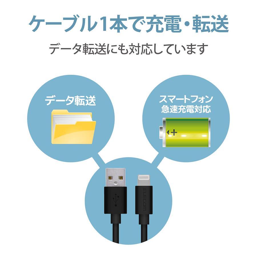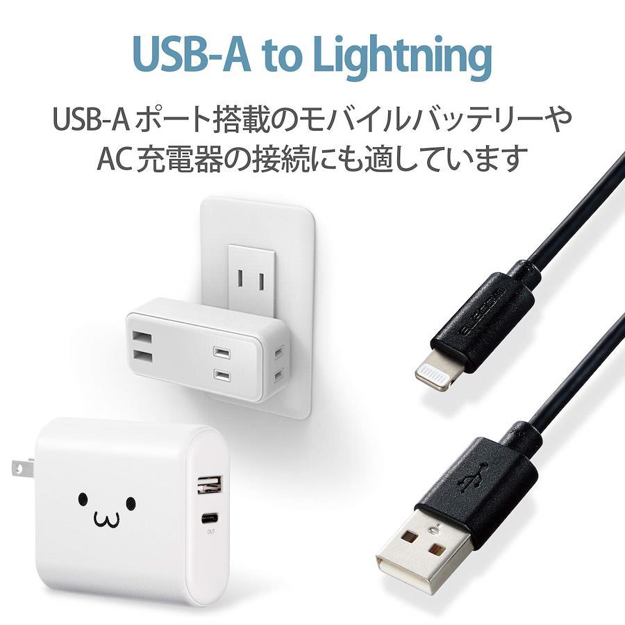iPhoneやiPod、iPadなどのLightningコネクター搭載機器とUSB-A端子を搭載しているパソコンを接続し、充電・データ通信が可能なLightningケーブルです。※iPadはパソコンからは充電できません。Apple社製品に対応したUSB-Aポート付きの充電器との接続で、家庭用コンセントから充電可能です。最大12W(5V/2.4A)の大電流で接続機器の充電が可能です。 ※ご使用になるパソコンなどの性能によって、供給される電流値が異なります。USB Power Delivery非対応です。サビなどに強く、信号劣化を抑える金メッキピン(USB-Aオス側)を採用しています。EUの「RoHS指令(電気・電子機器に対する特定有害物質の使用制限)」に準拠(10物質)した、環境にやさしい製品です。