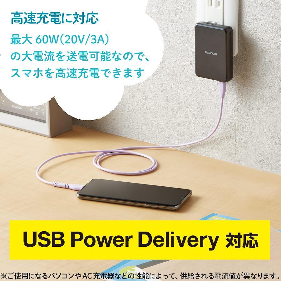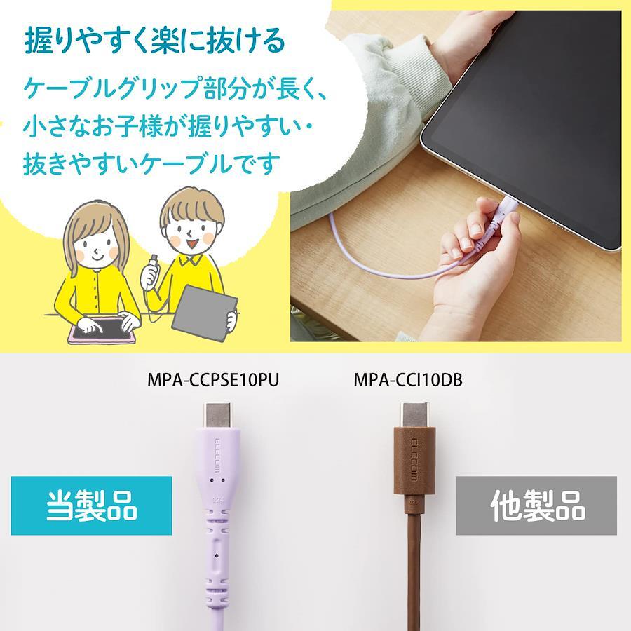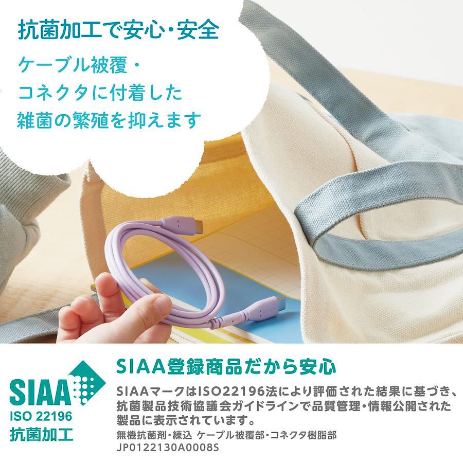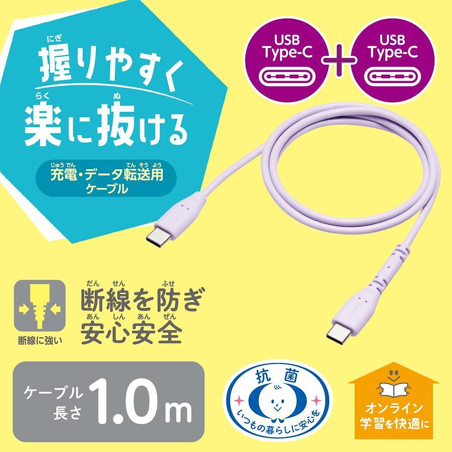 【 仕様 】■ コネクタ形状1:USB Type-C(TM)オス■ コネクタ形状2:USB Type-C(TM)オス■ 対応機種:USB Type-C(TM)端子を持つパソコン・充電器・モバイルバッテリーおよび、USB Type-C(TM)端子を持つスマートフォン・タブレットなど※USB Type-C and USB-C are trademarks of USB Implementers Forum■ ケーブル長:1.0m ※コネクター含まず■ ケーブル太さ:3.2mm■ 規格:USB2.0規格正規認証品、 Chromebook 対応認定品■ 対応転送速度:最大480Mbps ※理論値■ パワーデリバリー対応:○■ プラグメッキ仕様:金メッキピン■ シールド方法:2重シールド■ カラー:パープル■ パッケージ形態:ブリスター【 説明 】■ USB Type-C(TM)端子を搭載しているパソコン及び充電器・モバイルバッテリーなどに、USB Type-C(TM)端子を搭載しているスマートフォンやタブレットを接続し、充電やデータ転送ができるUSB2.0ケーブルです。※USB Type-C and USB-C are trademarks of USB Implementers Forum■ ケーブルグリップ部分が長く、小さなお子様が握りやすい・抜きやすいUSBケーブルです。■ こちらの製品は表面上における細菌の増殖を抑制、あるいは阻害する性能を有したもので、財団法人日本規格協会(JSA)が定める抗菌性試験に準拠したものです。■ 断線しにくい高密度配線ケーブルを採用しています。■ SIAA(抗菌製品技術協議会)は、抗菌・防カビ・抗ウイルス加工製品に関する品質や安全性のルールを整備し、そのルールに適合した製品にSIAAマーク表示を認めています。■ ※抗菌とは、製品の表面上に存在する細菌の増殖を抑制することです。JIS(日本産業規格)では抗菌加工されていない製品の表面と比較して、細菌を99%以上抑制出来ている場合、その製品に抗菌効果があると規定しています。■ 最大480Mbpsの高速データ転送が可能です。■ USB Power Deliveryに対応し、最大60W(20V/3A)の大電流を送電可能です。※ご使用になるパソコンやAC充電器などの性能によって、供給される電流値が異なります。■ 最大480Mbpsの高速データ転送が可能です。■ 難燃性の素材を使用し、安全性を高めています。■ 外部ノイズの干渉から信号を保護する2重シールドケーブルを採用しています。■ サビなどに強く信号劣化を抑える金メッキピンを採用しています。■ この製品は、 Google の互換性基準を満たすためにエレコム株式会社によって認定されています。Google は、この製品の動作や、該当する安全要件やその他の安全要件の遵守について責任を負いません。この製品は、製品の契約条件に従ってエレコム株式会社によってのみサービスおよびサポートされます。テクニカルサポートとカスタマーサービスについては、エレコム株式会社に直接お問い合わせください。Chromebook および "Works With Chromebook" のラベルは、 Google LLC の商標です。Google が定める、所定の性能や品質基準を満たした商品の証である Chromebook 対応認定を取得しています。「Works With Chromebook」とは、Google が提供する Chrome OS を搭載したコンピューター「 Chromebook 」に対して、サードパーティが製造した周辺機器(アクセサリ)類のために用意された対応認定プログラムおよびロゴの名称です。【商品に関するお問い合わせ】エレコム総合インフォメーションセンターTEL. 0570-084-465FAX. 0570-050-012受付時間 / 10:00~19:00 年中無休