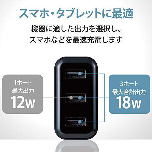 【 仕様 】■ 対応機種:3つのUSB Type-Aポートから、それぞれ最大12W(5V/2.4A)、合計最大18W(5V/3.6A)までの出力で充電、給電可能な機器とその組み合わせ■ コネクタ形状:USB Type-A(メス)×3■ 定格入力電圧:AC100-240V 50/60Hz■ 定格入力電流:0.6A■ 定格出力電力:合計18W■ 定格出力電圧:5V■ 定格出力電流:3ポート合計3.6A、1ポート最大2.4A■ 外形寸法:約 幅55mm×厚み30mm×高さ55mm ※ACプラグ収納時■ 重量:約73g■ カラー:ブラック■ コンセントプラグ仕様:90度スイング構造、耐トラッキングスリーブ付■ 法令:◇PSE 特定電気用品■ 使用可能地域:日本■ 保証期間:1年■ その他:おまかせ充電機能搭載