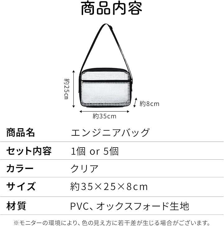「商品詳細」セット内容:エンジニアバッグ 1個 or 5個 カラー:クリア サイズ:約35x25x8cm 材質:PVC、オックスフォード生地