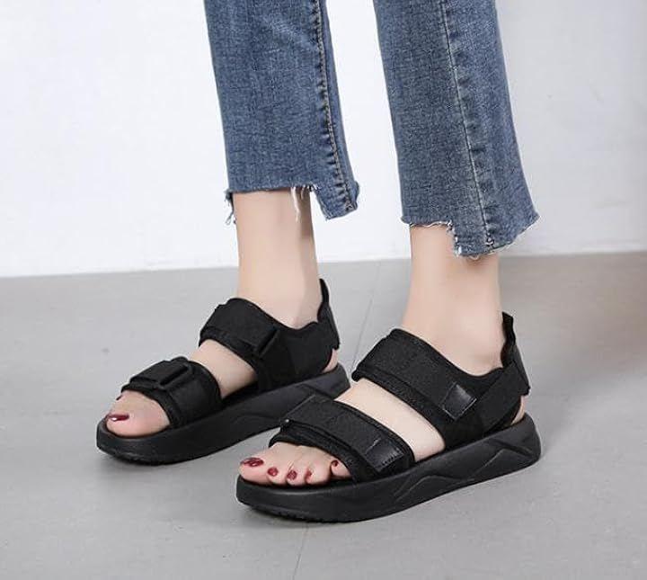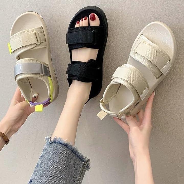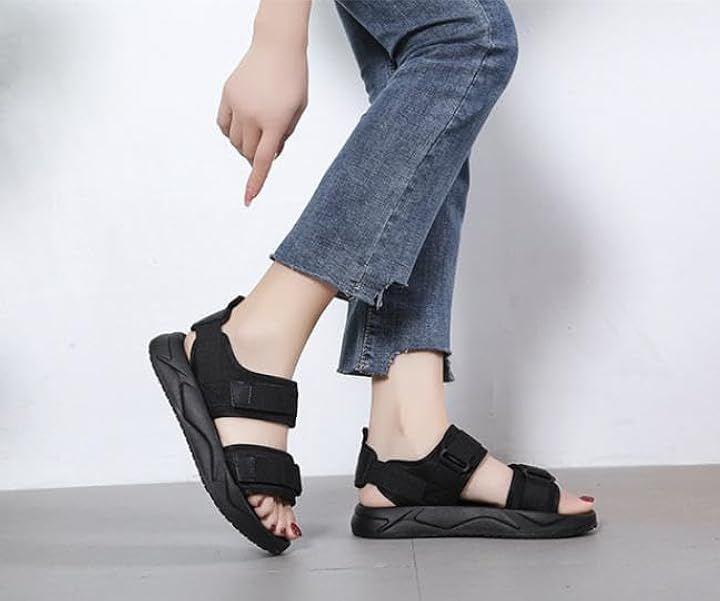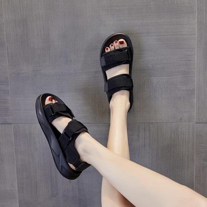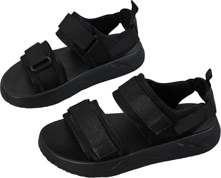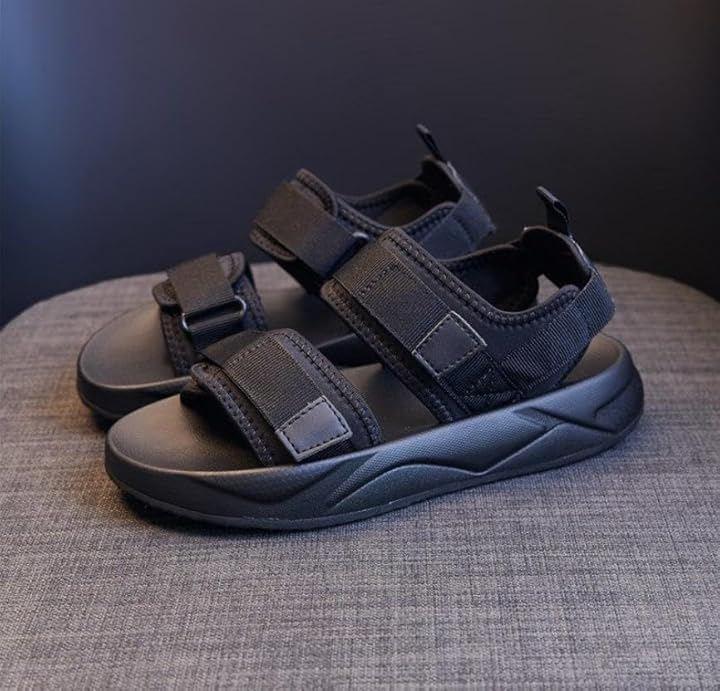 *つま先・甲・に調節可能な面テープ付きベルトを配置した2連ベルトデザインのスポーツサンダル。