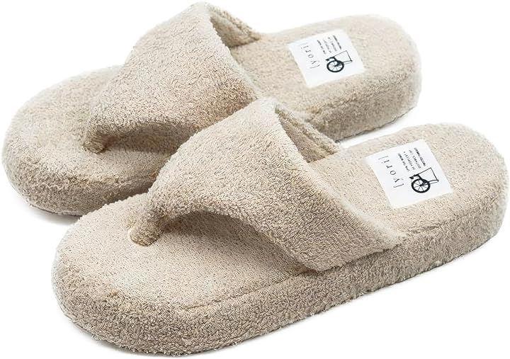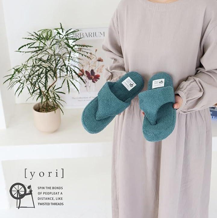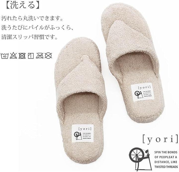 *綿100%のコットンパイル素材のサンダル風ルームシューズは、足先の解放感があり、ムレが気になる方にもおすすめのトングタイプスリッパ。