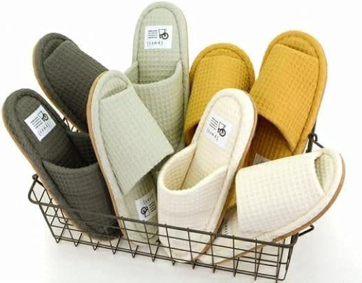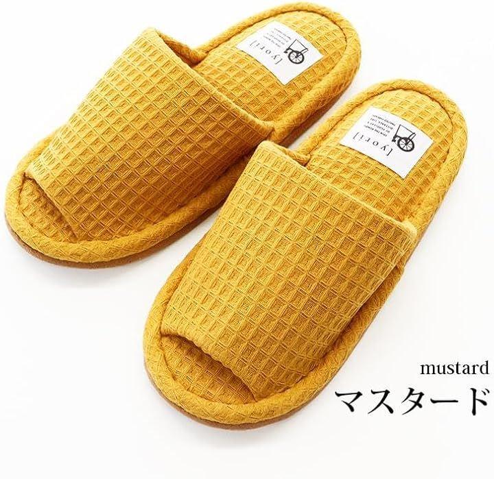 綿100%のコットンワッフル素材のスリッパは、中敷き甲裏もコットンなので、素足に履いて心地いいアイテム。