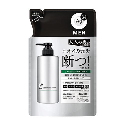 【ご注意】・目に入らないようにご注意ください。もし入った場合はすぐに水かぬるま湯で洗い流してください。・乳幼児の手の届かないところにおいてください。・湿しん・皮ふ炎(かぶれ・ただれ)などの皮ふ障害があるときには、悪化させるおそれがありますのでお使いにならないでください。・かぶれたり、しげきを感じたときには、ご使用をおやめください。・必ず「エージデオ24メン 薬用メンズボディクレンズ」の容器につめかえてください。・つめかえる容器の中味を使い切ってから、そのまま全量をつめかえてください。・水道水や他の商品と混ぜないで下さい。・雑菌が入るのを防ぐため、空のボトルの内側は洗わずにそのままご使用ください。洗った場合は、必ずよく乾かしてからつめかえてください。・衛生的にお使いいただくため、2~3回つめかえた後は、新しい本体をお求めください。・つめかえ後は、袋の下部の製造記号(英数字)を控えておいてください。・お肌に傷やはれもの・湿しんなどの異常が生じていないかよく注意して使用してください。・お肌に合わないときは、使用を中止し、皮ふ科医などにご相談ください。
