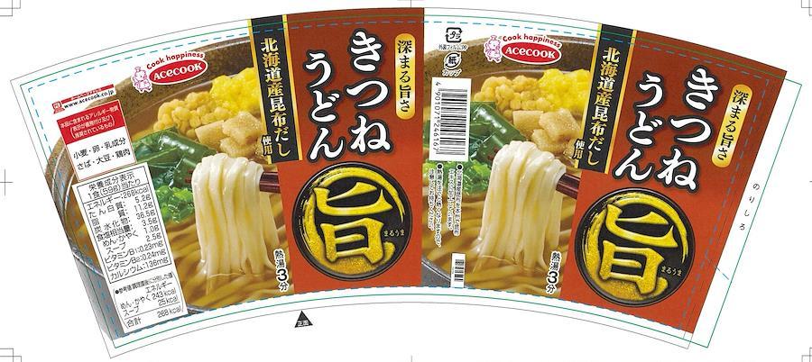 油揚げめん(小麦粉(国内製造)、植物油脂、食塩、植物性たん白、チキン調味料、砂糖、野菜調味料)、スープ(食塩、糖類、しょうゆ、コンブエキス、酵母エキス、カツオエキス、カツオブシパウダー、魚介風味調味料、粉末しょうゆ、植物油脂、シイタケエキス、全卵粉)、かやく(味付油揚げ、卵、わかめ、ねぎ)/加工でん粉、調味料(アミノ酸等)、炭酸カルシウム、リン酸三ナトリウム、酸化防止剤(ビタミンE)、カラメル色素、甘味料(スクラロース)、ウコン色素、ビタミンB2、ビタミンB1、カロチノイド色素、(一部に小麦・卵・乳成分・さば・大豆・鶏肉・豚肉を含む)