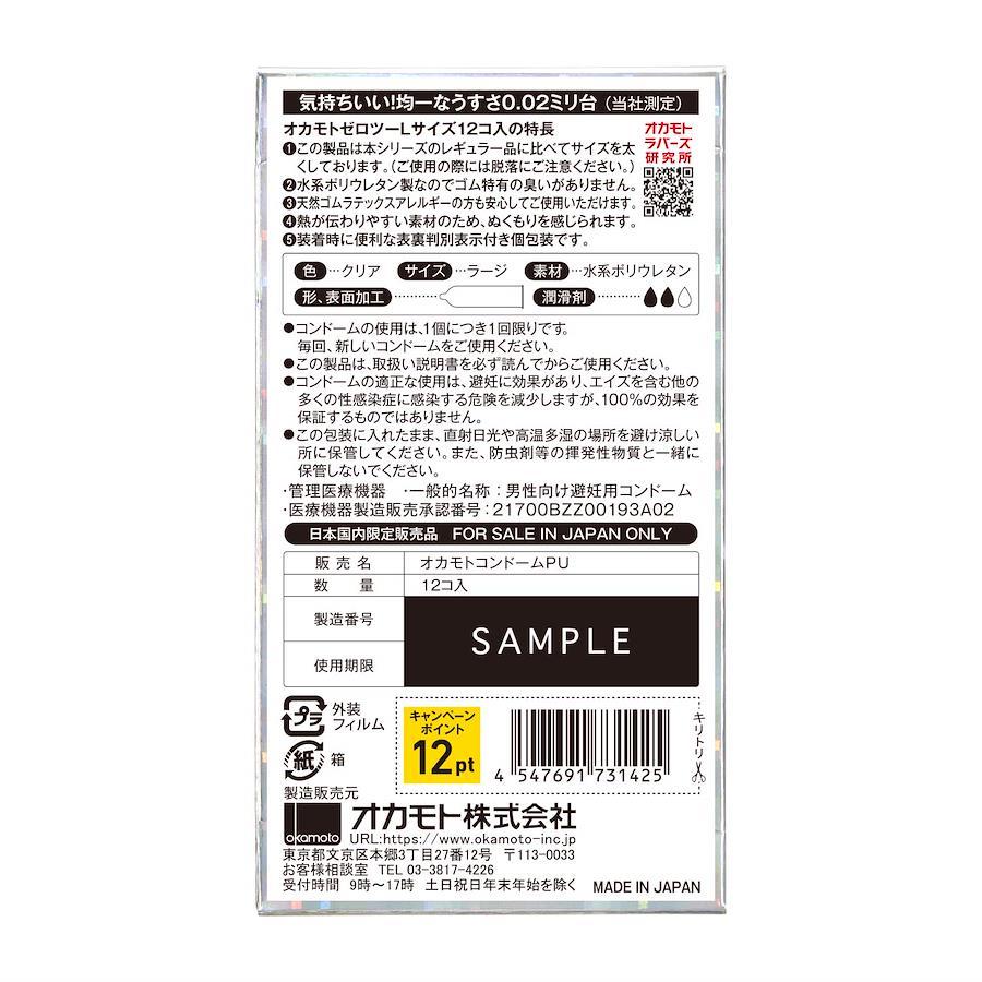 ・コンドームの使用は、1回につき1回限りです。毎回、新しいコンドームをご使用ください。・この製品は取扱い説明書を必ず読んでからご使用下さい。・コンドームの適正な使用は、避妊に効果があり、エイズを含む他の多くの性感染症に感染する危険を減少しますが、100%の効果を保証するものではありません。・この包装に入れたまま、冷暗所に保管して下さい。また防虫剤等の揮発性物質と一緒に保管しないでください。水系ポリウレタン製コンドーム! うすさ均一! 0.02mm! ラテックスアレルギーを考慮した水系ポリウレタン製。Lサイズ。潤滑剤/ジェル多め。カラー/クリア 形・表面加工。 管理医療機器 医療機器認証(承認)番号:21700BZZ00193A02 原産国 :日本 内容量 :12個 商品サイズ (幅×奥行×高さ) :パッケージサイズ:76mm×26mm×136mm 材質 :ポリウレタン