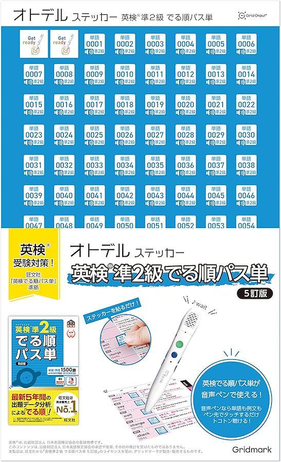 ■商品説明オトデルペン(音声ペン)は別売です。本商品はオトデルペンを既にお持ちのお客様がご利用いただくことができるステッカー単品の商品です。 対応書籍「英検準2級でる順パス単 5訂版」(旺文社発行)は別売です。 本製品は、旺文社から「英検でる順パス単 5訂版 シリーズ」のライセンスを受け、グリッドマークが製造・販売するものです。 オトデルステッカー(準2級用) ・ステッカー内容:15シート(112枚/シート) ・シートサイズ:110×182×0.2(mm)/シート ・素材:紙(ステッカー・台紙) 本商品はステッカー単品の商品です。オトデルペンは付属していません。すでにオトデルペンをお持ちのお客様は本商品を購入後、PCにて音声データをDL・ペンに追加いただければ、お手持ちのペンがそのままご利用いただけます。