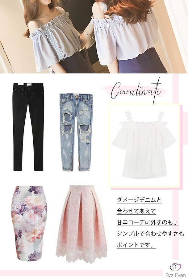 花柄レースの肩紐がガーリーな雰囲気バッチリ* ずり落ちる心配がないから、オフショルが苦手な方も取り入れやすいデザインです。