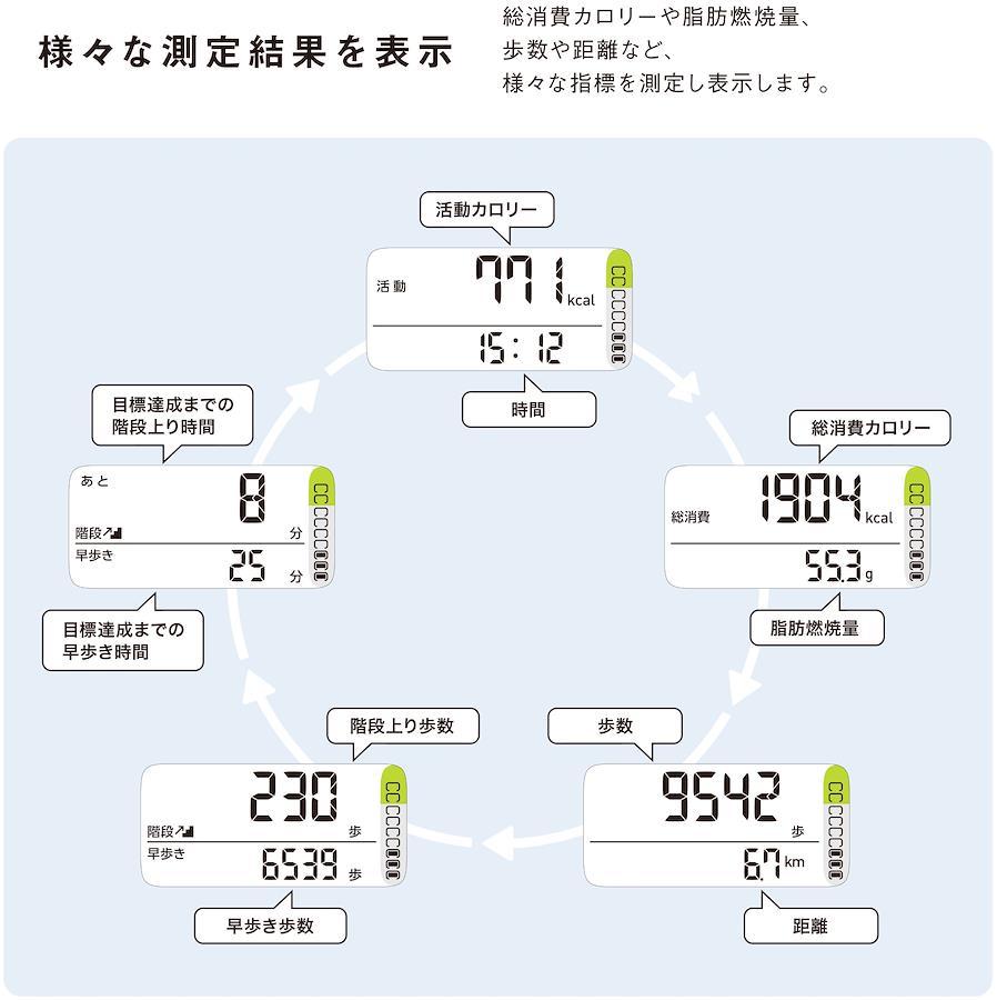 :●毎日の行動がエクササイズに。●階段上りは、カロリー消費に効果あり。階段や早歩きの消費カロリーも、しっかりチェック!●【目標達成インジケータ】1日の目標活動カロリーに対する達成度がひと目でわかるので、モチベーションをあげて毎日の運動に取り組めます。●【様々な測定結果を表示】総消費カロリーや脂肪燃焼量、歩行や距離など、様々な指標を測定し表示します。