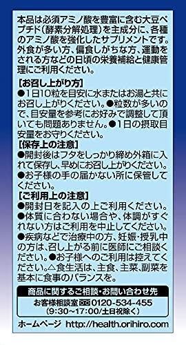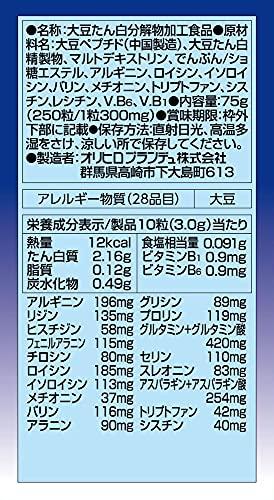 必須アミノ酸を豊富に含む大豆ペプチド(酵素分解処理)を主成分に、各種のアミノ酸を強化したサプリメント。 内容量:75g(300mg*250粒) 1日量(目安):10粒 サイズ:60*60*100(mm) ビタミンB1とビタミンB6の栄養機能食品です。原料には、消化吸収に優れた大豆ペプチドや各種のアミノ酸を使用。 約25日分