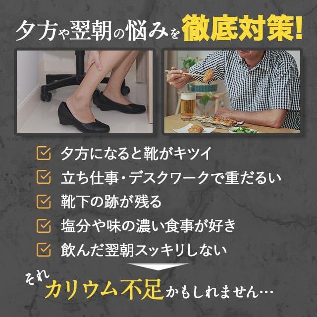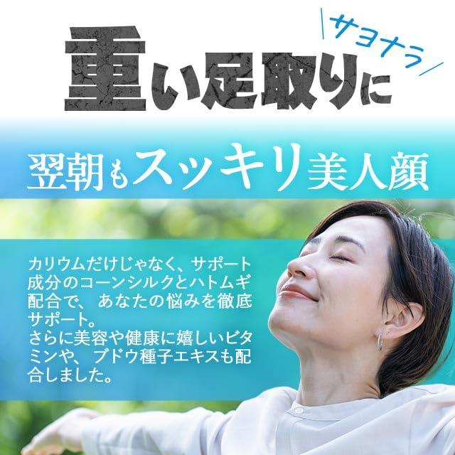 ■サイズ:??21x9.9x2.3cm;90g 【こんなお悩みありませんか?】・夕方になると靴がキツイ・立ち仕事 デスクワークで重だるい・靴下の跡が残る・塩分や味の濃い食事が好き・飲んだ翌朝スッキリしない・・・それ、カリウム不足かもしれません。 【重い足取りにサヨナラ!】カリウムだけではなく、サポート成分のコーンシルクとハトムギ配合で、あなたの悩みを徹底サポート。さらに美容や健康に嬉しいビタミンや、ブドウ種子エキスも配合しました。 【カリウムって?】カリウムはバナナなどの果物や野菜に含まれるミネラル。ナトリウムと水分バランスにかかわりが深く、塩分の濃い食事が多い方には特に大切な成分です。不足するとバランスが崩れ、様々な悩みや足がつる原因になることも… 【栄養機能食品】栄養機能食品(ビタミンB1、ビタミンB2、ビタミンB6)ビタミンB1は炭水化物からのエネルギー産生と皮膚や粘膜の健康維持を助ける栄養素です。ビタミンB2は皮膚や粘膜の健康維持を助ける栄養素です。ビタミンB6はたんぱく質からのエネルギー産生と皮膚や粘膜の健康維持を助ける栄養素です。 【商品詳細】主要原料(1粒あたり):塩化カリウム125.0mg/ブドウ種子エキス末5.0mg/クエン酸5.0mg/コーンシルクエキス末5.0mg ※約1ヶ月(約30日)分の内容量になっております。※バランスの良い食事や運動を心がけ、毎日の生活サポートにお役立て下さい。 ■重要なお知らせ原材料・成分ハトムギ抽出物(デキストリン、ハトムギエキス)(国内製造)、ブドウ種子エキス、コーンシルクエキス末/結晶セルロース、塩化カリウム、ステアリン酸カルシウム、二酸化ケイ素、クエン酸、ビタミンB1、ビタミンB2、ビタミンB6 ※商品は原料由来の為、製造時期により色合いが多少異なる場合がございます。