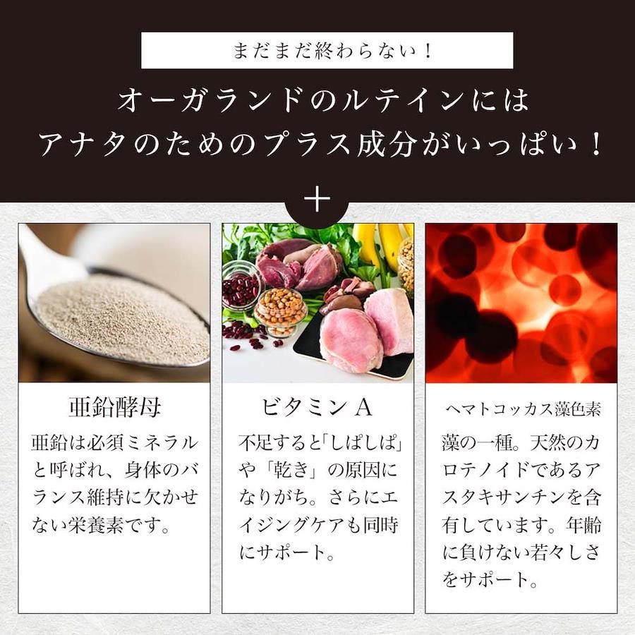 ■サイズ:??20.8x10.3x2.4cm;70gパソコンやテレビに触れる機会が多い方へおすすめの「ルテイン」を配合したサプリメントです。ルテインは緑黄色野菜や果物に含まれるカロテノイドの一種で、年齢とともに減少し、不足すると、さまざまな健康トラブルにつながると言われています。光やテレビなどのダメージに働くと言われ、長時間パソコンを使用する方などのデジタルケアにおすすめのルテインを1カプセルあたり8mg配合しました。さらに、プラス成分として、しょぼしょぼや重さのダメージケアに有用とされる亜鉛、ビタミンA、調節のサポートに有用とされるアスタキサンチンを配合しました。▼こんな方におすすめ・長時間テレビやパソコンを使われる方・細かい作業をよくされる方・健康トラブルが気になる方・毎日のダメージが気になる方バランスの良い食事や運動を心がけ、毎日の生活サポートにお役立て下さい。 【デジタル社会の皆さまへ】 1日に必要とされるルテインを1カプセルあたり8㎎以上配合。PCをよく使う方や映画鑑賞、ゲームが好きな方へなど、仕事でも休みでも画面を見続けている方へ。 【ブルーベリーとルテイン】 ブルーベリーに含まれているアントシアニンはルテインを置くまで運ぶ役割を持っていると言われています。その為、ブルーベリーとルテインは同時に摂取することが効率が良く望ましいとされています。 【プラス成分】 千里眼の木と言われる「メグスリノキ」や「亜鉛酵母」、ビタミンAなどを配合しています。 【内容量】 265mg×30カプセル(6個セット・約6ヶ月分) ■重要なお知らせ安全上のお知らせ保管方法:高温多湿を避け、常温にて保管してください。原材料・成分原材料:サフラワー油、ゼラチン、亜鉛含有酵母、メグスリノキ抽出物(デキストリン、メグスリノキエキス)/グリセリン、マリーゴールド色素、グリセリン脂肪酸エステル、ビタミンA、ヘマトコッカス藻色素※薬を服用中あるいは通院中の方、妊娠・授乳中の方は医師にご相談の上お召し上がりください。※商品は原料由来の為、製造時期により色合いが多少異なる場合がございます。使用方法お召し上がり方:1日に1~2カプセルを目安にお召し上がりください。
