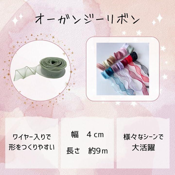 「KAZARI日和 オーガンジーリボン」は、幅4cm、長さ約9mのたっぷりサイズで、透け感が美しい高品質リボンです。