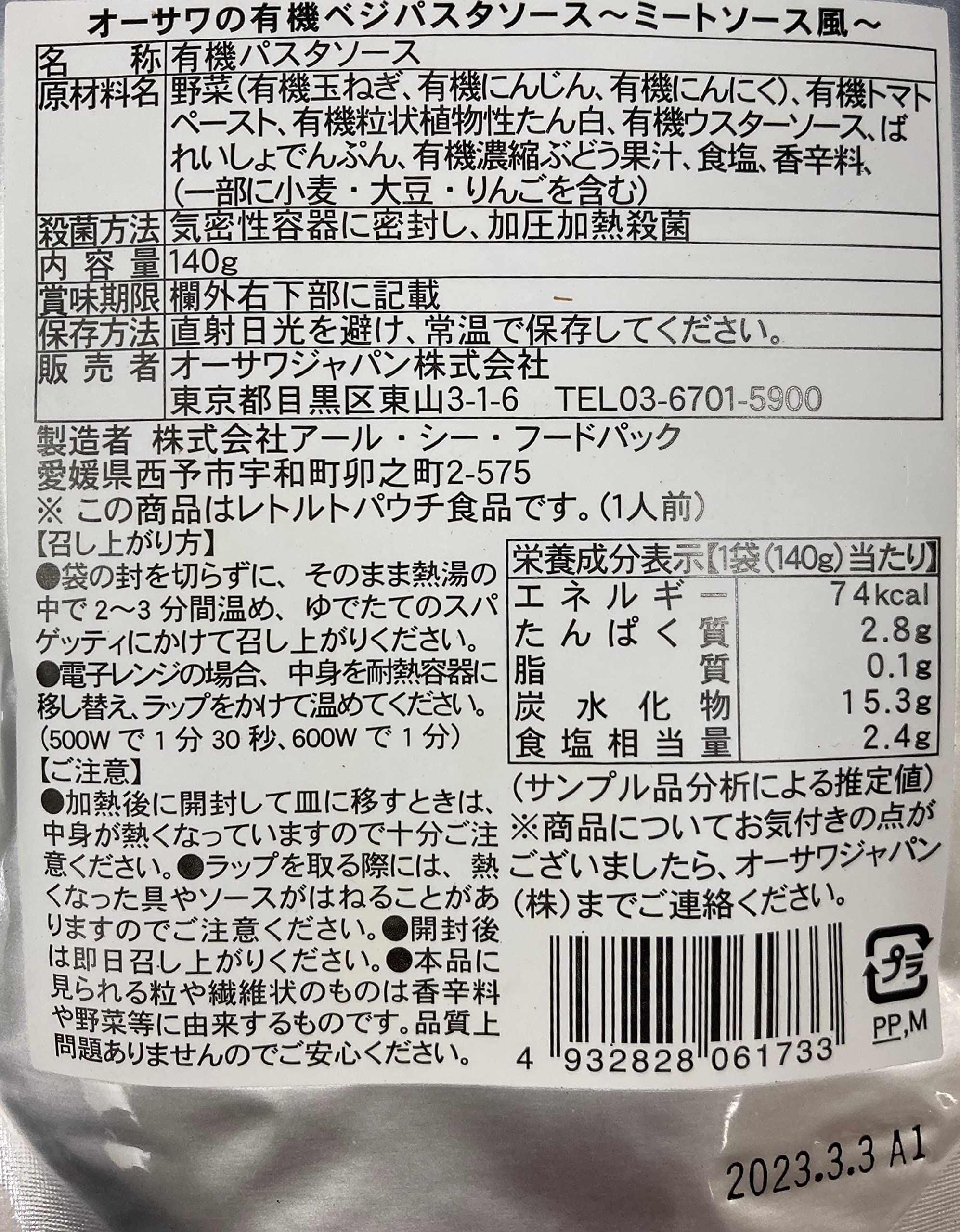 内容量:140gカロリー:74kcal/1袋(140g)原材料:野菜【有機玉ねぎ・人参・にんにく(国内産)】、有機トマトペースト(アメリカ・イタリア産他)、有機粒状植物性たん白(スイス産)、有機ウスターソース、馬鈴薯でんぷん(北海道産)、有機濃縮ぶどう果汁(トルコ産)、食塩(メキシコ・オーストラリア・沖縄産)、香辛料(エジプト・オーストラリア・トルコ・マレーシア・ベトナム・インドネシア産他)商品サイズ(高さx奥行x幅):20mm×160mm×110mm【重要】メーカーによる商品リニューアルに伴いパッケージ(内容量も含む)変更が行われた場合、新パッケージでお届け致します事ご了承願います。