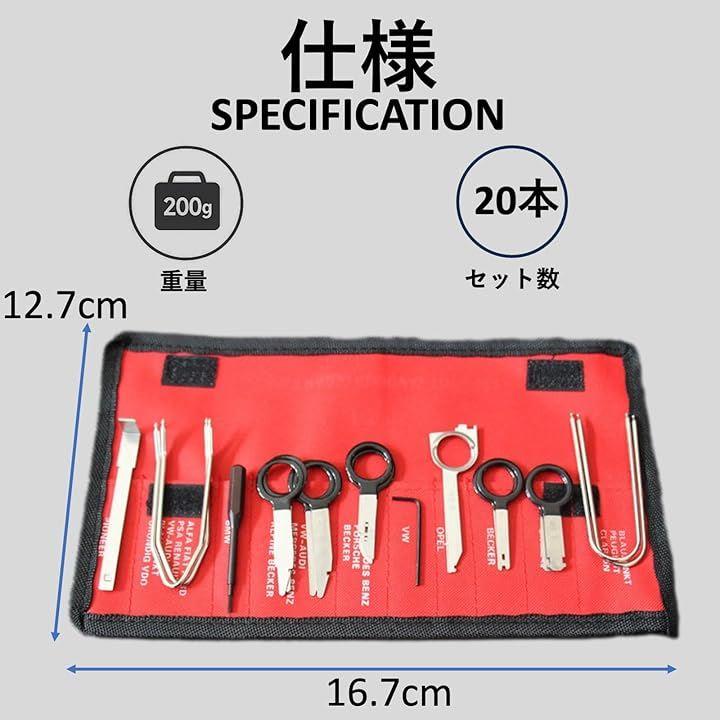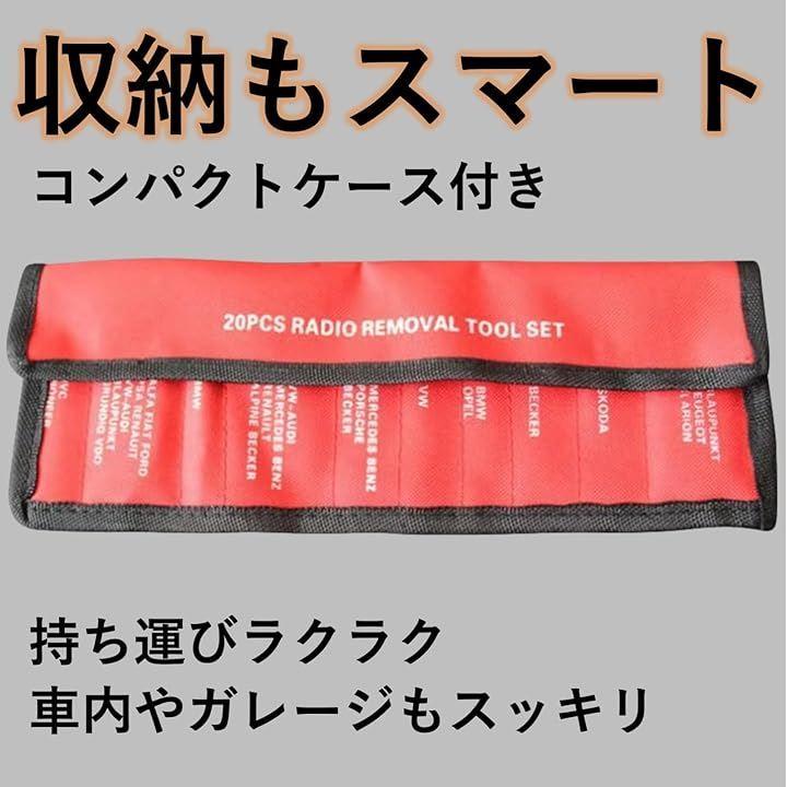 20本セットにてご用意しておりますので、車種別だけでなく、カーオーディオのメーカー別の工具も揃っておりますので、個人のDIYユースからプロの現場まで幅広くお使いいただくことが可能です。