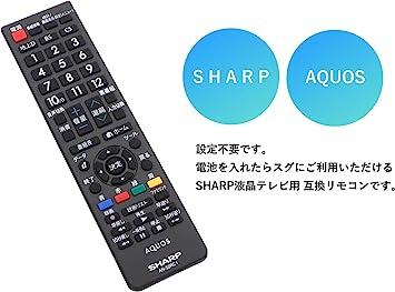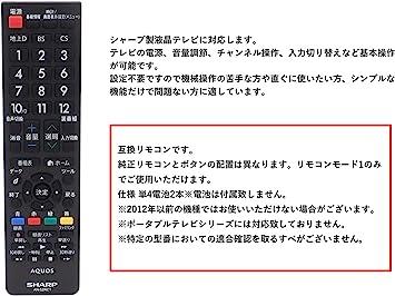 設定不要です。電池を入れたらスグにご利用いただけるSHARP液晶テレビ用 互換リモコンです。単4電池(AAA)2本は別途ご用意ください。シャープ製液晶テレビに対応します。テレビの電源、音量調節、チャンネル操作、入力切り替えなど基本操作が可能です。設定不要ですので機械操作の苦手な方や直ぐに使いたい方、シンプルな機能だけで問題ない方に適しています。互換リモコンです 純正リモコンとボタンの配置は異なります。リモコンモード1のみでご使用いただけます。仕様 単4電池2本※電池は付属致しません ※2012年以前の機種ではお使いいただけない場合がございます※ポータブルテレビシリーズには対応致しておりません。※特定の型番においての適合確認を取るすべがございません。●製品内容 シャープ製液晶テレビ 互換リ