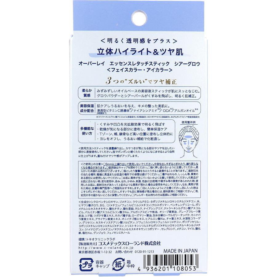 立体ハイライト・明るい透明肌!●これ1本で保湿からメイクまで理想の肌に。・スキンケア成分・メイク直し・ハイライター●柔らか質感。・みずみずしいオイルベースの美容液スティックが肌にスッとなじむ。・グロウパウダーとシアーパールがくすみを飛ばし、明るく肌補正。●美容保湿成分配合。・肌ケアしうるおいを与え、キメの整った美肌に。浸透型ビタミンC誘導体/ナイアシンアミド/CICA/アルガンオイル●多機能な使い方。・くすみや凹凸を光拡散効果で明るく飛ばす。・乾燥が気になる部分に塗布し、簡単保湿ケア。・Tゾーン、頬、鎖骨など高い位置に塗布し立体的に。・ヨレをオフし、うるおい補給で化粧直し。●シアーグロウ色。