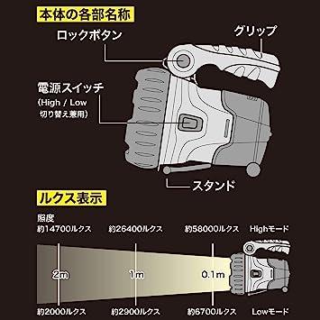 使用電源:リチウムイオンバッテリー(3.7V 2400mAh内蔵)※交換不可光束(ルーメン):(約)700ルーメン(High)、100ルーメン(Low)※満充電時照度(ルクス):約26400ルクス(High/1m)※満充電時充電時間:約5時間 ※環境温度などにより異なります連続使用時間:(約)1.5時間(High)、15時間(Low)※満充電時