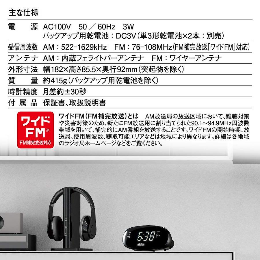 【 仕 様 】■ 電源:AC100V 50/60Hz 3W バックアップ用乾電池:DC3V(単3形乾電池×2本、別売)■ 受信周波数:AM…522-1629kHz FM…76-108MHz(FM補完放送「ワイドFM」対応)■ アンテナ:AM…内蔵フェライトバーアンテナ、FM…ワイヤーアンテナ