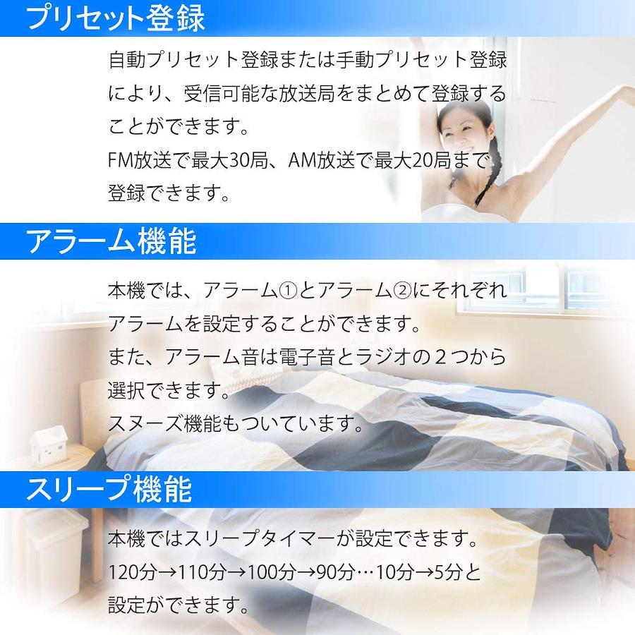 【 特 長 】● デジタル選局だから、操作かんたん&感度良好● AM/FM受信(ワイドFM対応)● 高感度DSP選局● AM20局/FM30局プリセット(登録)機能付き● 見やすいデジタル表示● スヌーズ機能、2アラーム設定機能付き● スリープタイマー機能付き● 本体色はブラック取扱説明書