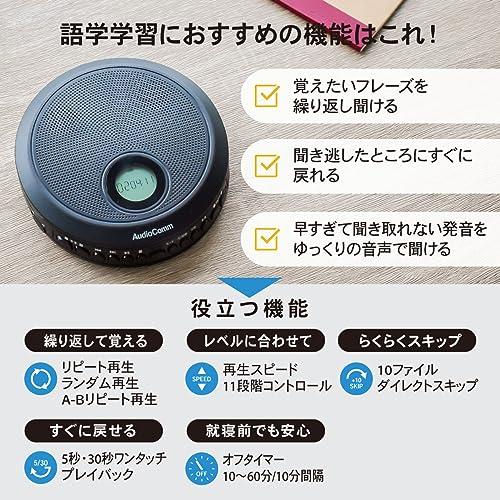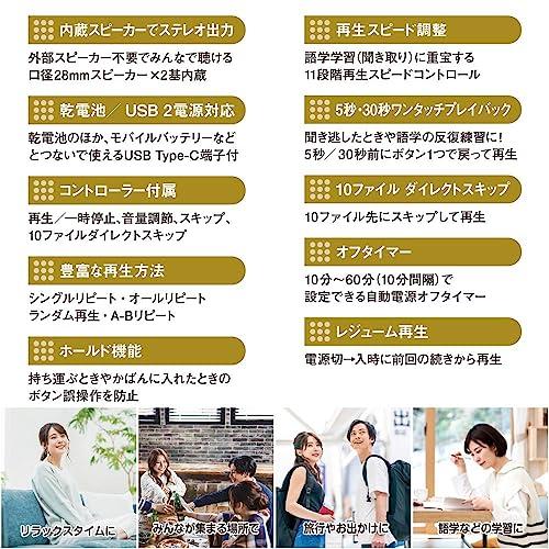 ●スピーカー内蔵で使いかた広がる!便利で役立つ機能をこれ1台に凝縮 ●口径28mmのスピーカー2基搭載、ステレオ出力でみんなで聴けます ●乾電池/USBの2電源対応、モバイルバッテリーなどとつないで使えるUSB Type-C端子付き ●再生/一時停止、音量調節、スキップ、10ファイルダイレクトスキップができるコントローラー付属 ●シングルリピート、オールリピート、ランダム再生、A-Bリピートと豊富な再生機能付き ●ホールド機能付きで、持ち運び時のボタン誤操作を防止します ●11段階再生スピードコントロール機能付きで、語学学習(聴き取り)に役立ちます ●5秒/30秒前にボタン1つで戻って再生できるワンタッチプレイバック機能付きで、聞き逃したときや語学の反復練習に役立ちます ●10ファイル先にスキップして再生できる、ダイレクトスキップ機能付き ●10分~60分(10分間隔)で設定できる、自動電源オフタイマー機能付き ●電源切→入時に前回からの続きを再生できる、レジューム再生機能付き ●本体カラーはブラック