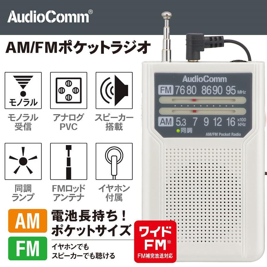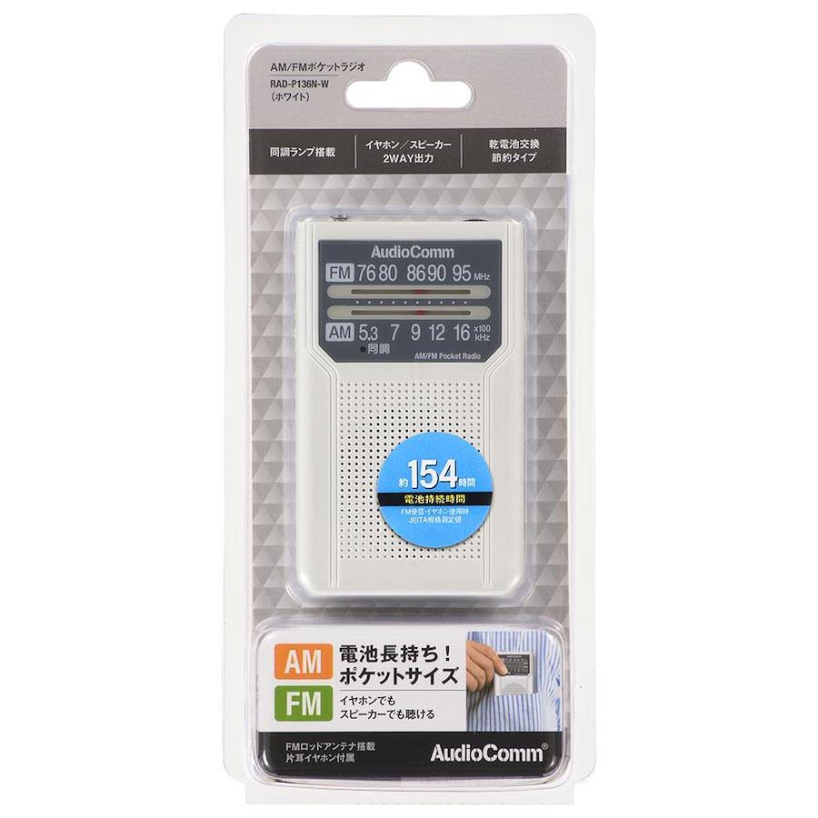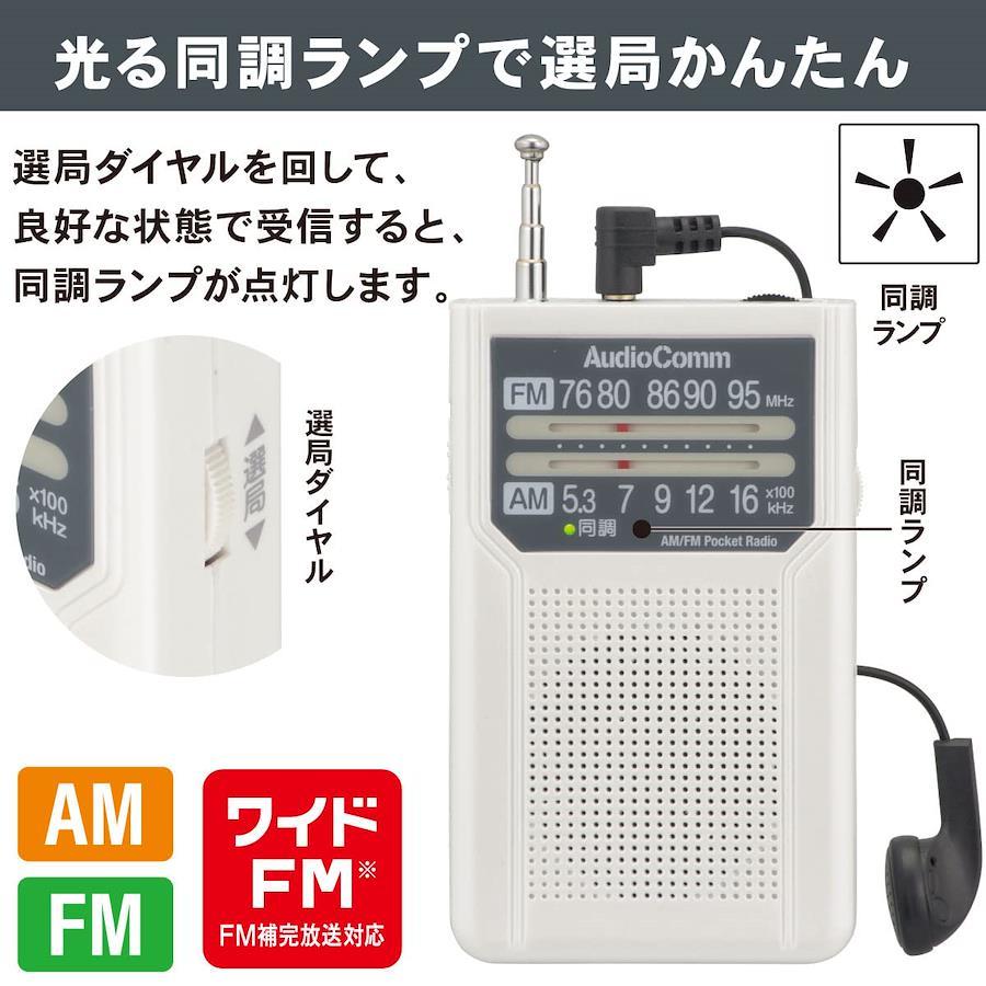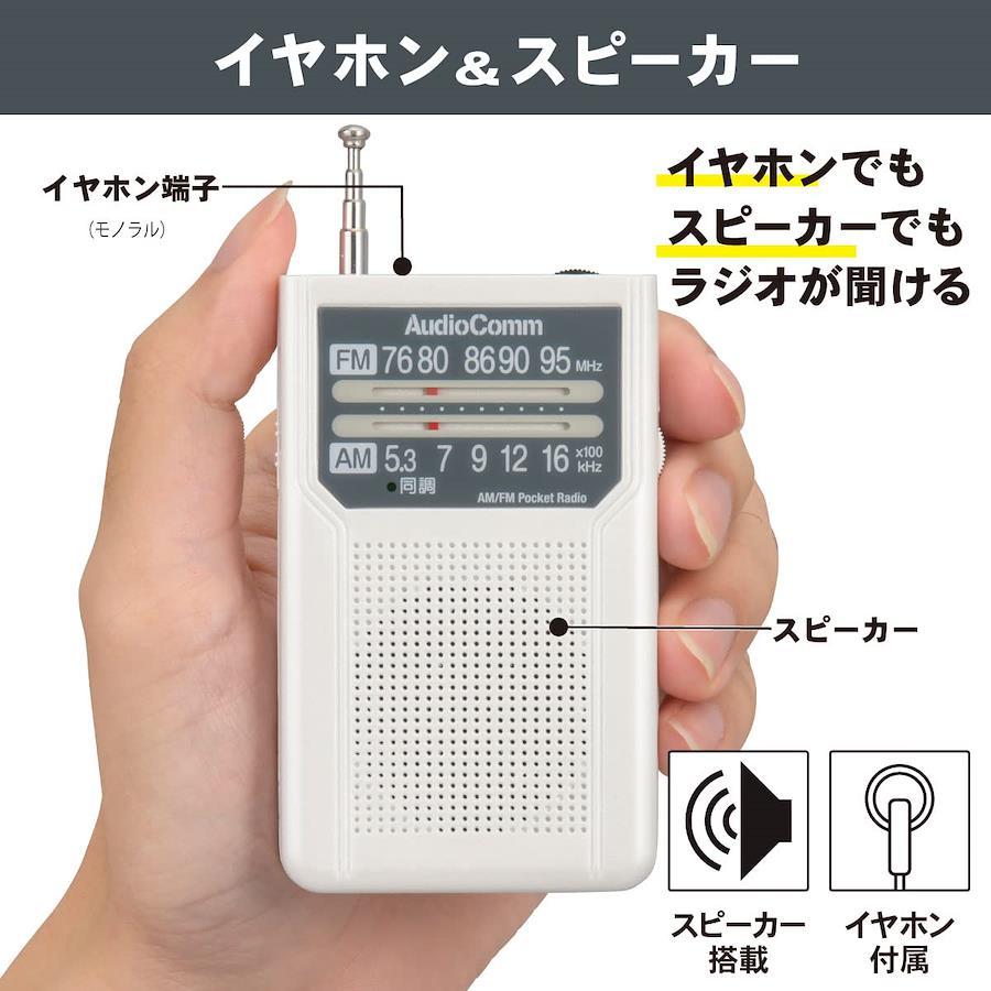 【 特 長 】 ◆ポケットサイズのコンパクトラジオ◆電池長持ち(約154時間持続) ◆イヤホン/スピーカー2WAY出力 ◆モノラル受信 ◆光る同調ランプ付き◆FMロッドアンテナ搭載 ◆ワイドFM(FM補完放送)対応 ◆片耳イヤホン付属 ◆本体カラーはホワイト【 仕 様 】 ◆電源:DC3V 単4形乾電池×2本(別売) ◆受信周波数:AM530-1605kHz FM76-95MHz ◆乾電池持続時間:※アルカリ乾電池新品使用、JEITA(電子情報技術産業協会)規格による測定値 スピーカー使用時:AM受信約82時間 FM受信約80時間 イヤホン使用時:AM受信約157時間 FM受信約154時間 ◆接続端子:イヤホン端子(φ3.5mmモノラルミニジャック) ◆外形寸法:幅55×高さ90×奥行20mm(突起物含まず) ◆質量:約69g(乾電池含まず) ◆付属品:イヤホン、保証書付取扱説明書【免責事項】メーカーによる商品リニューアルに伴いパッケージ(内容量も含む)変更が行われた場合、新パッケージでお届け致します事ご了承願います。