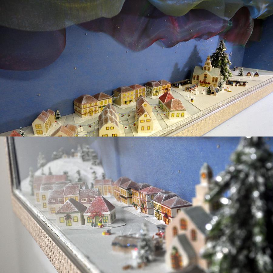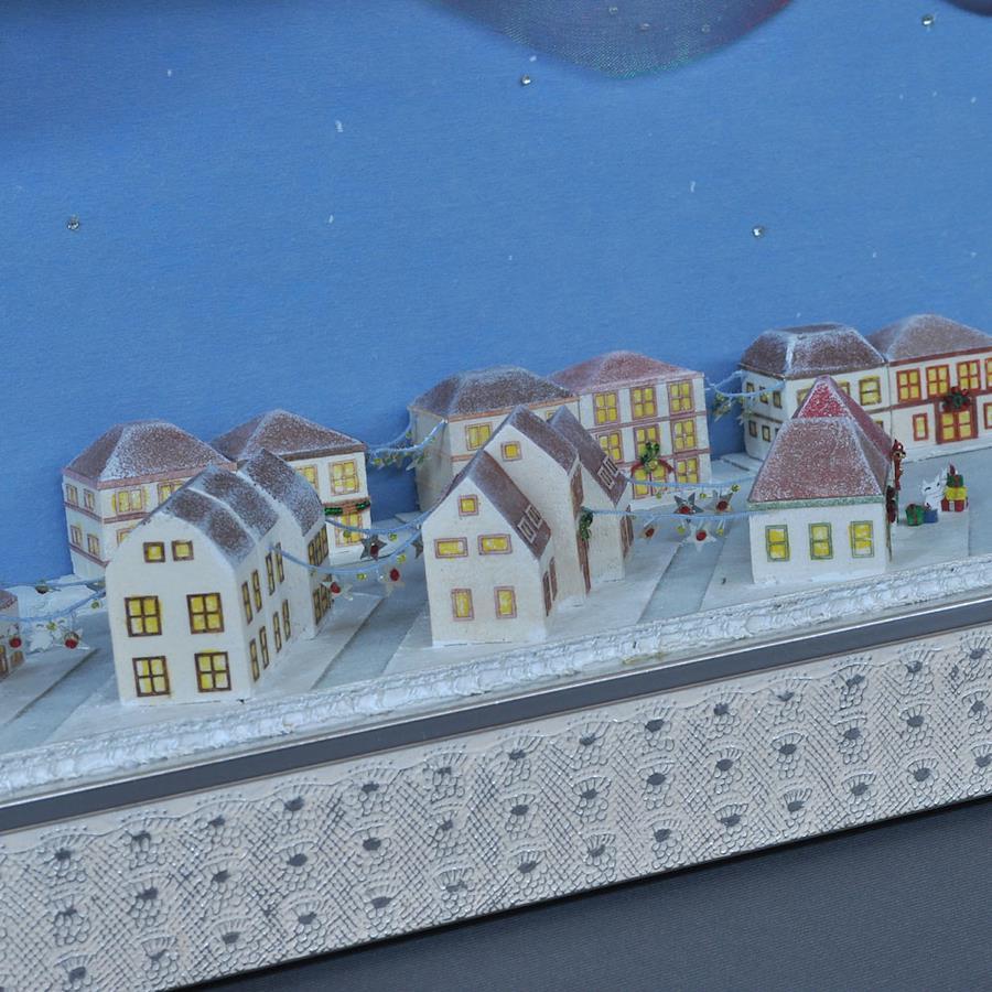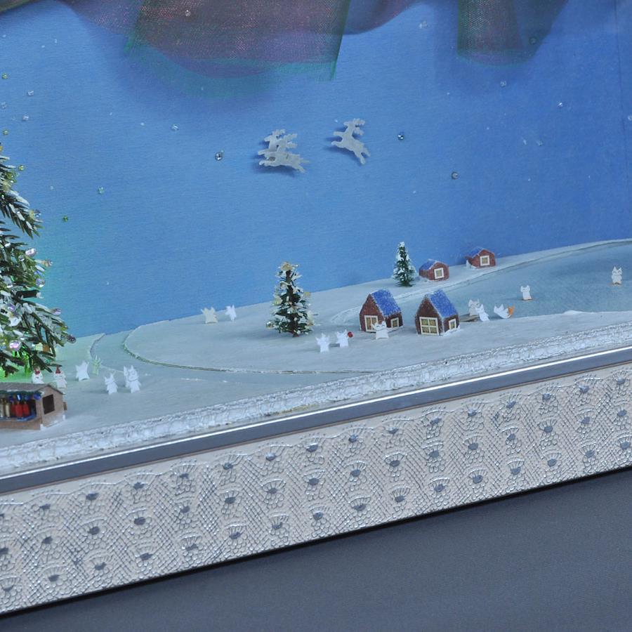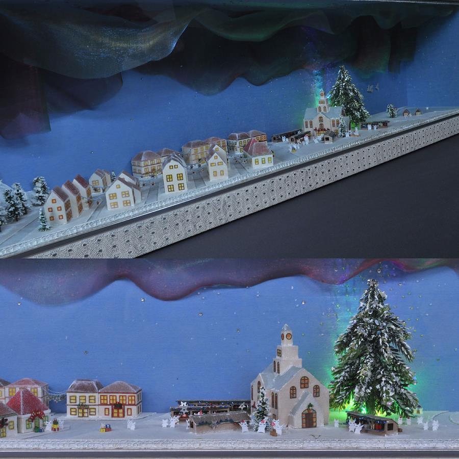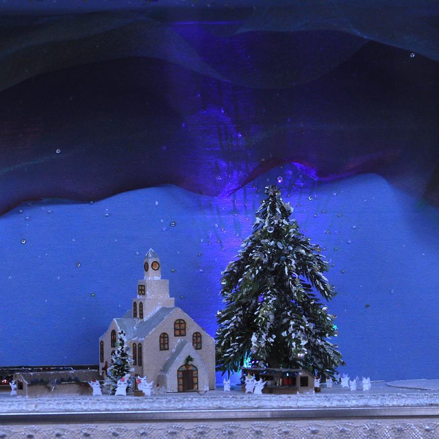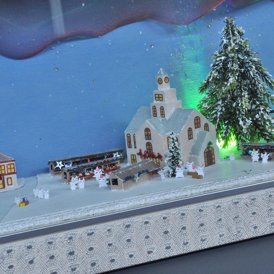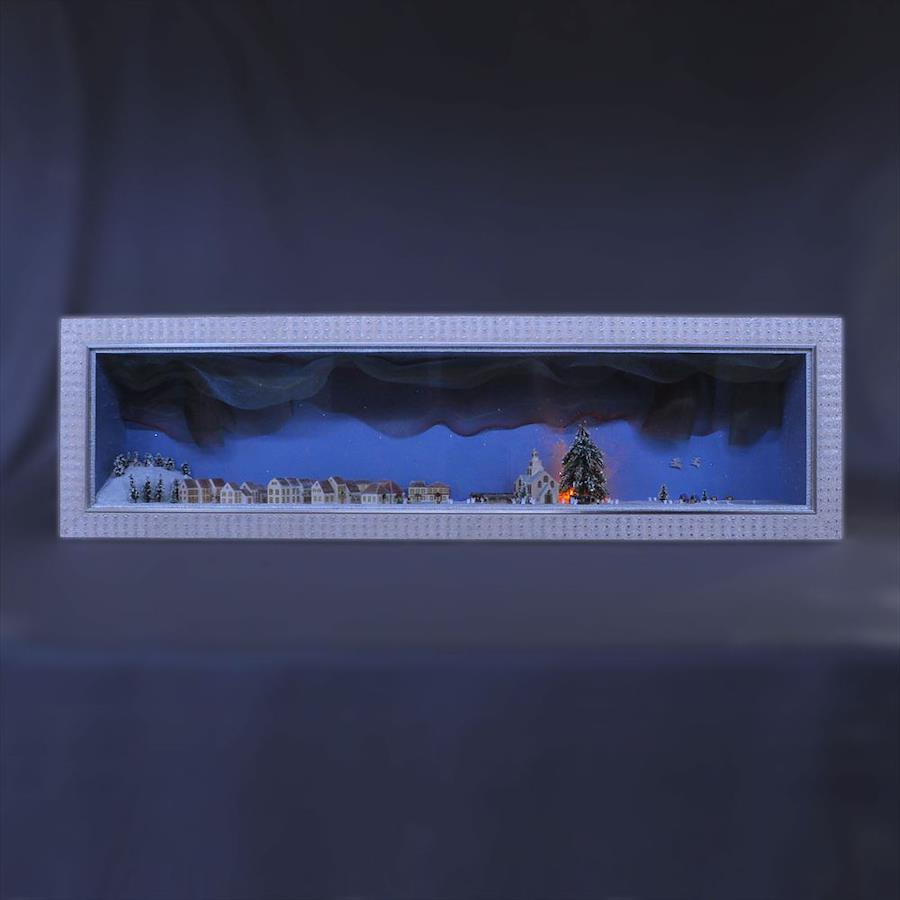 備考:机や棚に置いて、横から見る形です。覗き込むようにしてご鑑賞ください。パーツはすべて接着してあり、額の取り外しはできません。LED1灯で電飾。LEDは自動で色が時間変化します。向かって右手側面下部にスイッチあり。単四電池x3本使用します。