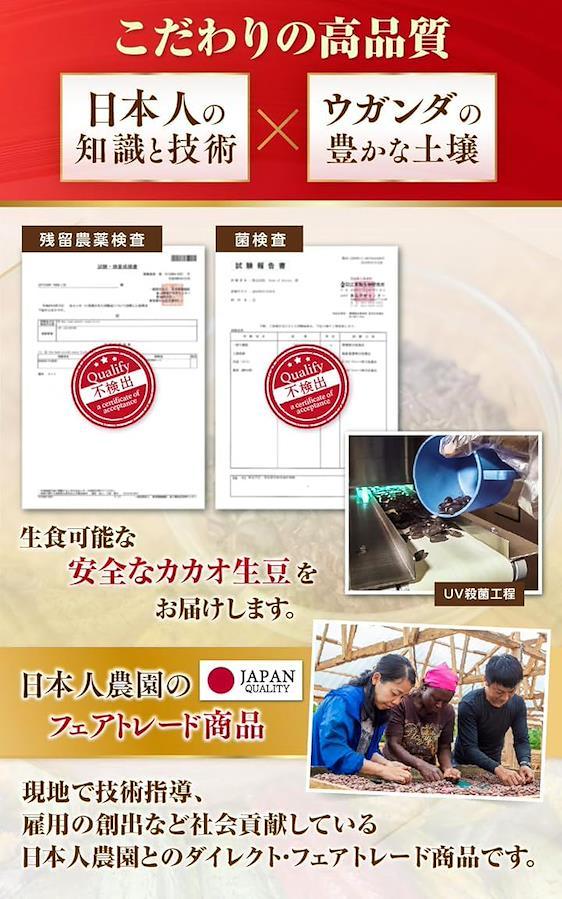 「日本人農園の安心品質;Japan Quality」「アフリカの真珠」と謳われる緑豊かなウガンダで、日本人の知識と技術で大切に育てられたカカオ豆。