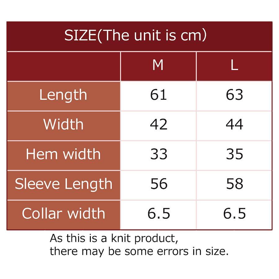 ■サイズM:着丈61cm/身幅42cm/裾幅33cm/袖丈56cm/襟幅6.5cmL:着丈63cm/身幅44cm/裾幅35cm/袖丈58cm/襟幅6.5cm※ニット商品の為、サイズは若干の誤差がありますのでご了承下さい。