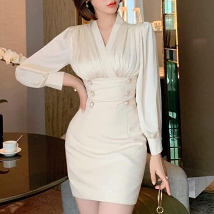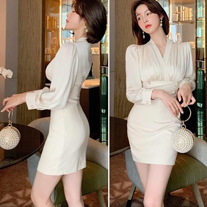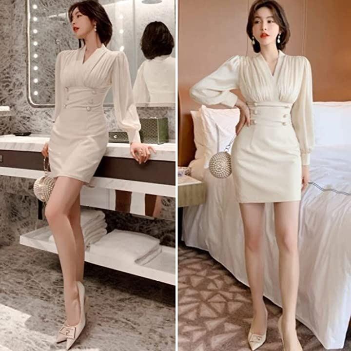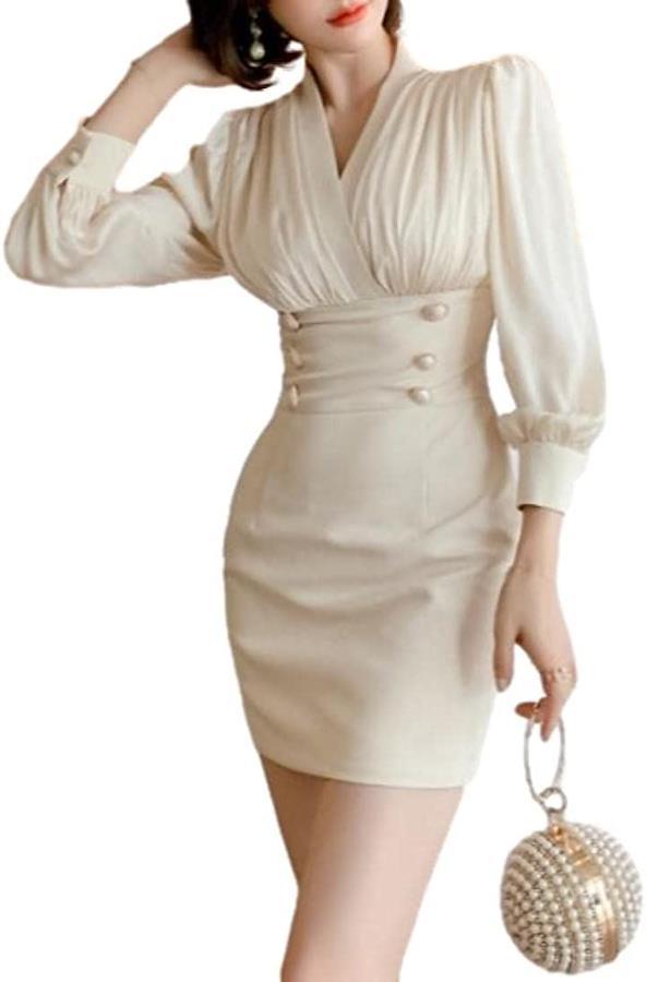 清潔感たっぷりな白シャツとボタン使いがコンサバでスタイリッシュなワンピース、パーティードレスです。