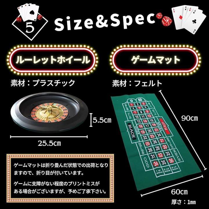 「セット内容」ルーレットホイール(玉付き)x1点、ゲームマットx1点 「ルーレット商品仕様」素材:プラスチック、サイズ:約5.5cmx25.5cm、重量:約103g、「ゲームマット商品仕様」素材:フェルト、サイズ:約90cmx60cm、重量:約250g