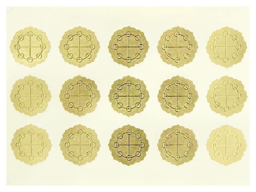 シールの直径は、約20mm。15枚入りです。縁取りは、やたのかがみをモチーフにしています。 平らで凸凹していない所に貼ってください。※合皮や、梨地、丸みのある面には対応していません。
