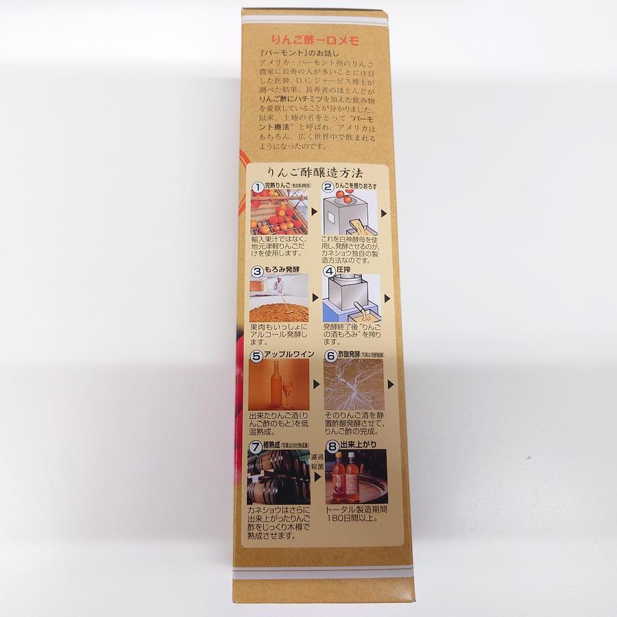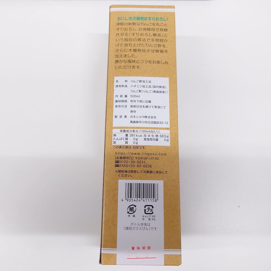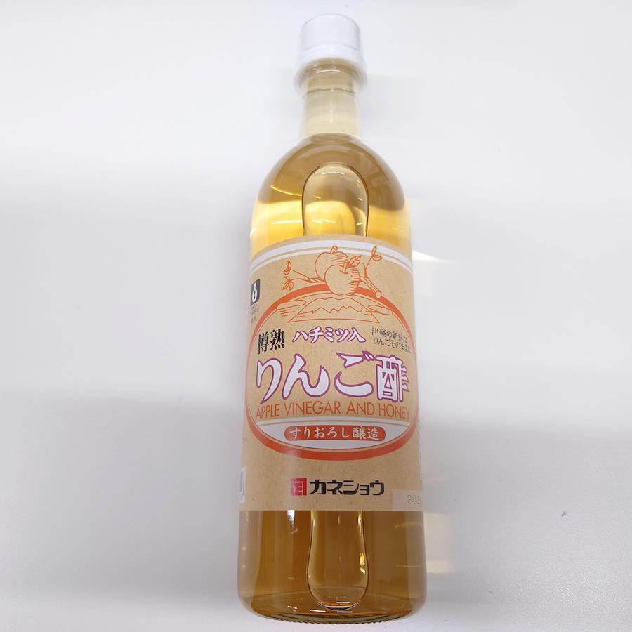 カネショウのハチミツ入りんご酢は津軽の新鮮なりんごを原料に独自の醸造方法“すりおろして発酵”させてできたりんご酢を木樽で熟成させハチミツを加えたものです。