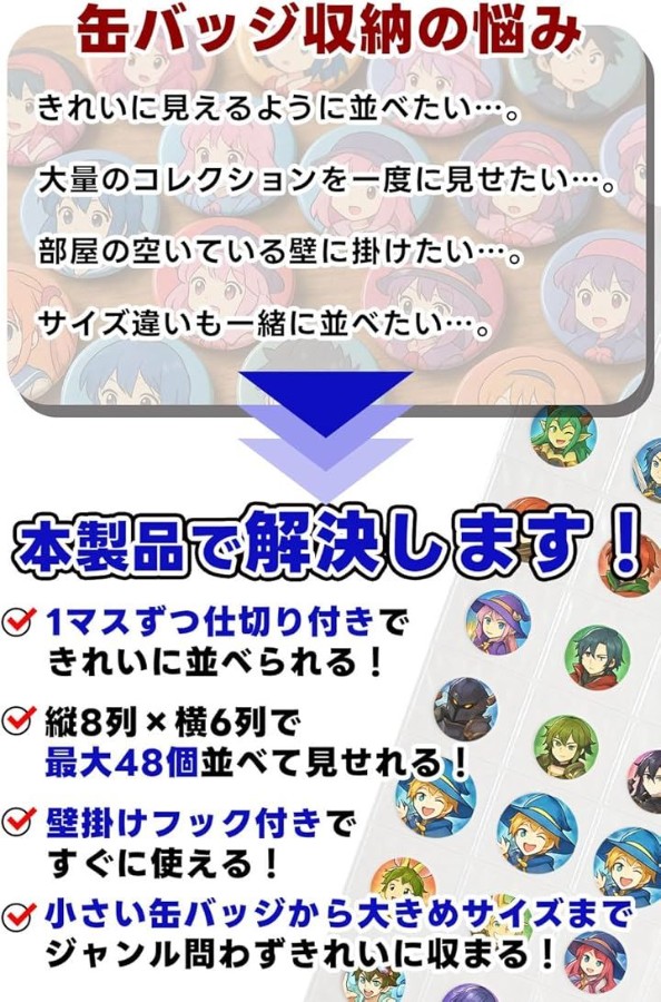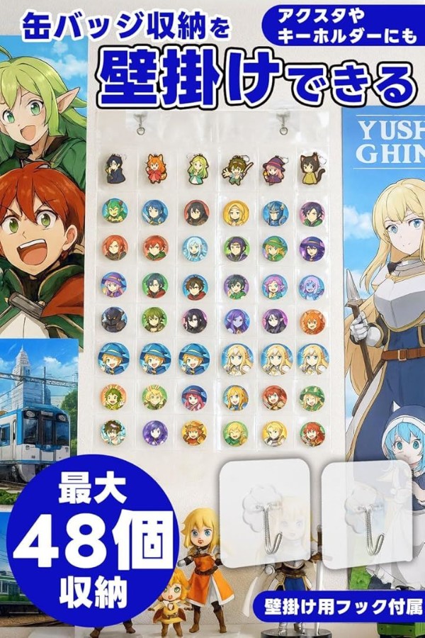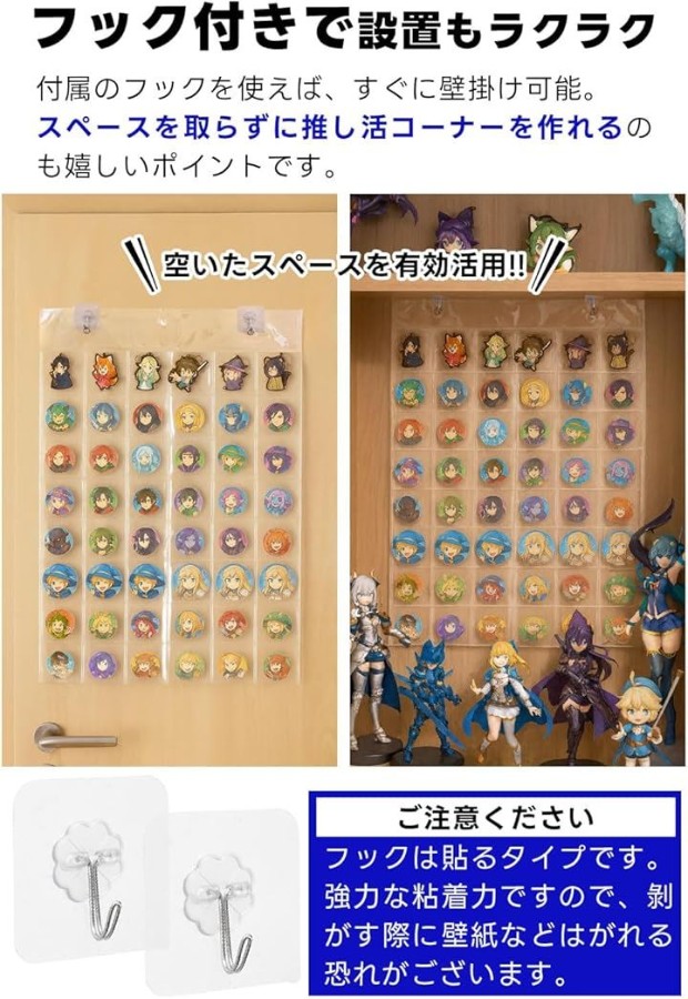 「壁掛けできる缶バッジ収納ファイル」お気に入りの缶バッジを最大48個、すっきりまとめて収納。