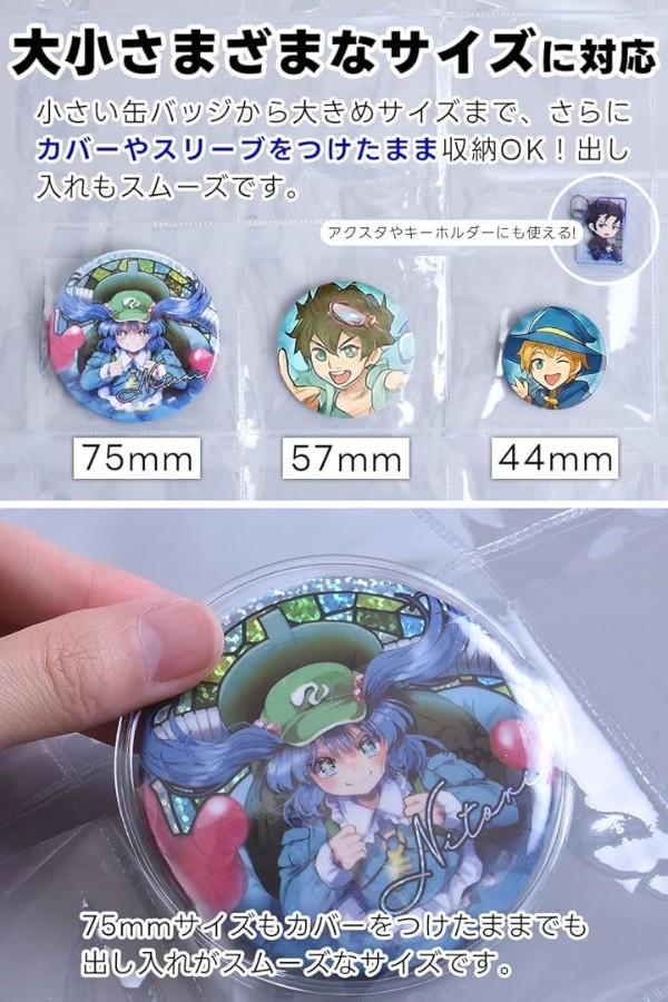 カバーやスリーブをつけたまま収納できるから、缶バッジを守りながらディスプレイ可能です。