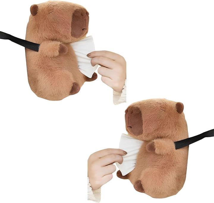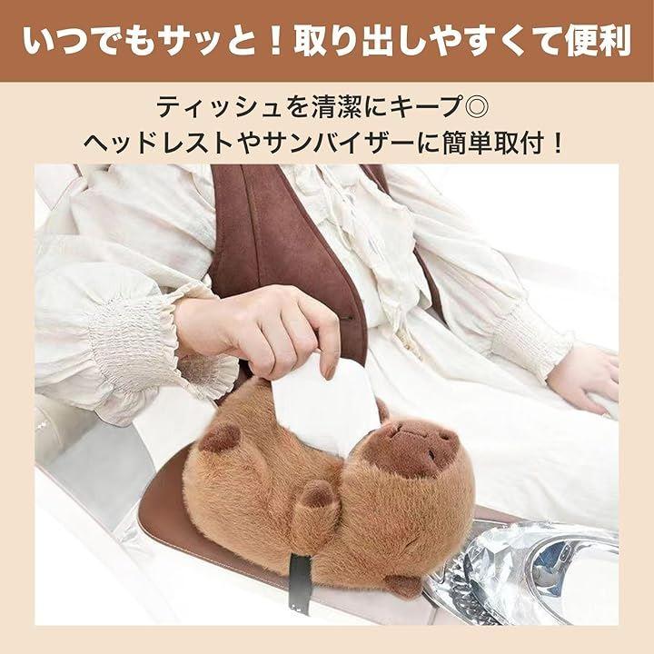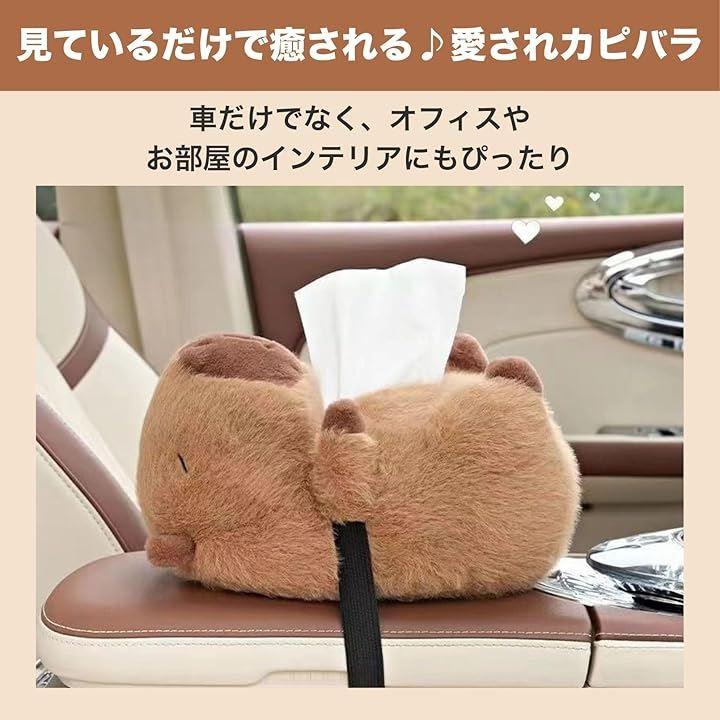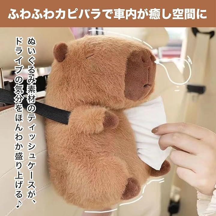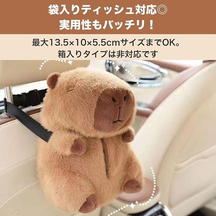 ふわふわのカピバラが車内を癒し空間に。ぬいぐるみ素材のティッシュケースは、優しい手触りと愛らしいデザインで旅の気分を盛り上げます。