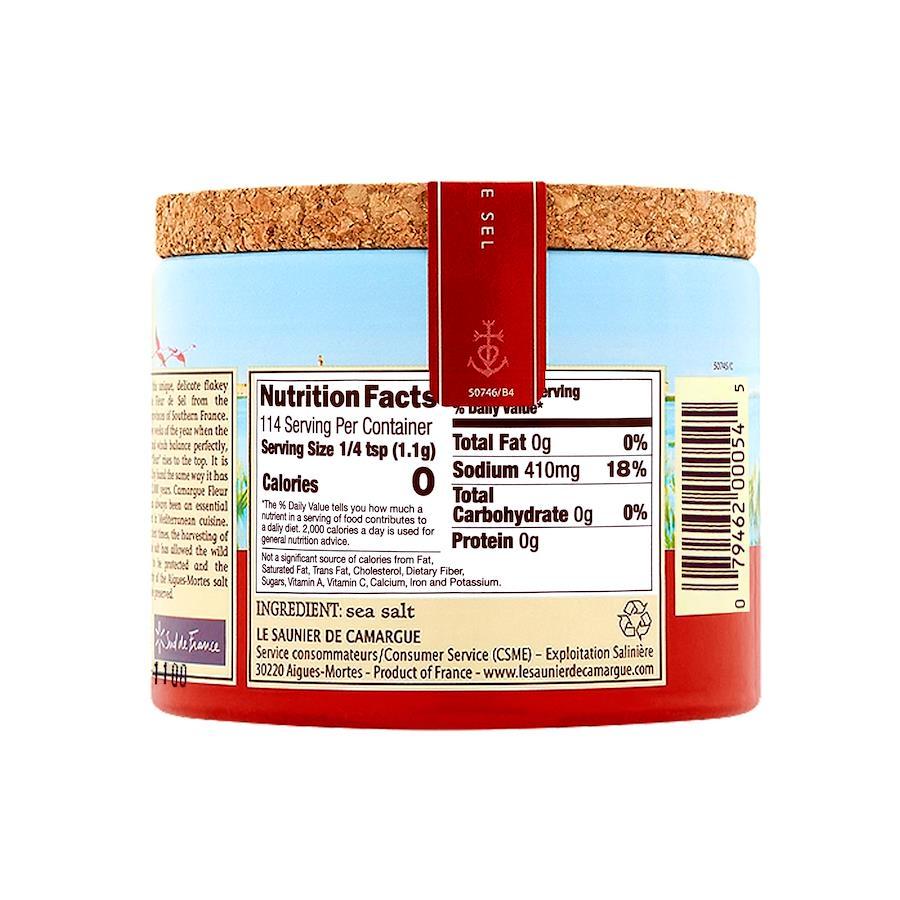 125g、紙筒、コルク蓋 地中海の海水を塩田に引き、 はじめに塩田の水面に現れた結晶を 伝統に習って手作業で採取しました。カマルグの中では最高品質。料理の仕上げにふりかけて味のアクセントに。エネルギー:0kclたんぱく質:0g脂質:0g炭水化物:0g水分:1~4%塩化ナトリウム:97%以下硫酸カルシウム:0.5%塩化マグネシウム:0.3%硫酸マグネシウム:0.2%塩化カリウム:0.1%