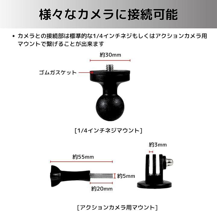 カメラとの接続部は標準的な1/4インチネジもしくはアクションカメラ用マウントで繋げることが出来ますので、GoPro Hero 10/9/8/7/6/5/4/3 + / 3/2/1などのGoProシリーズや、YI、Campark、SJCAM、DJI Osmo Action等のほとんどのアクションカメラに対応します。