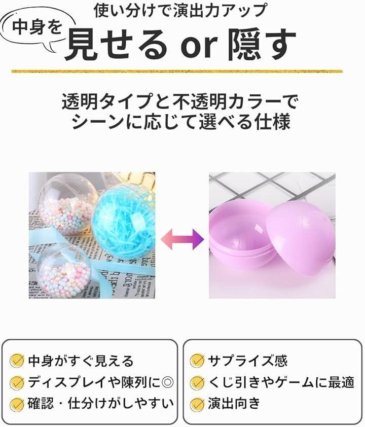 中身が透けて見えるタイプはディスプレイやプレゼント、梱包向けなどに、半透明カラータイプは景品入れやクレーンゲーム用などに、不透明カラータイプはクジ引きなどのサプライズ感を高める演出に適しています。
