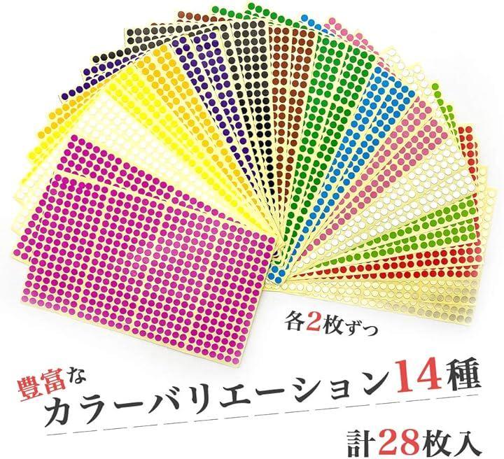 「商品内容」丸型カラーラベルシール:28枚入 カラー:14種(各2枚ずつ) 丸サイズ:直径6mm 1シート:408片 計11424片(28シート)